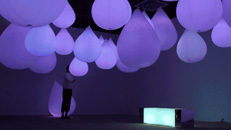 展厅中每一颗雨滴上方都连接有一个振动传感器,人们轻拍雨滴产生的振动将激活传感器,使雨滴改变色彩,而预先编好的程序同时将控制其他雨滴变成相应的颜色,形成一种光的传递的效果。