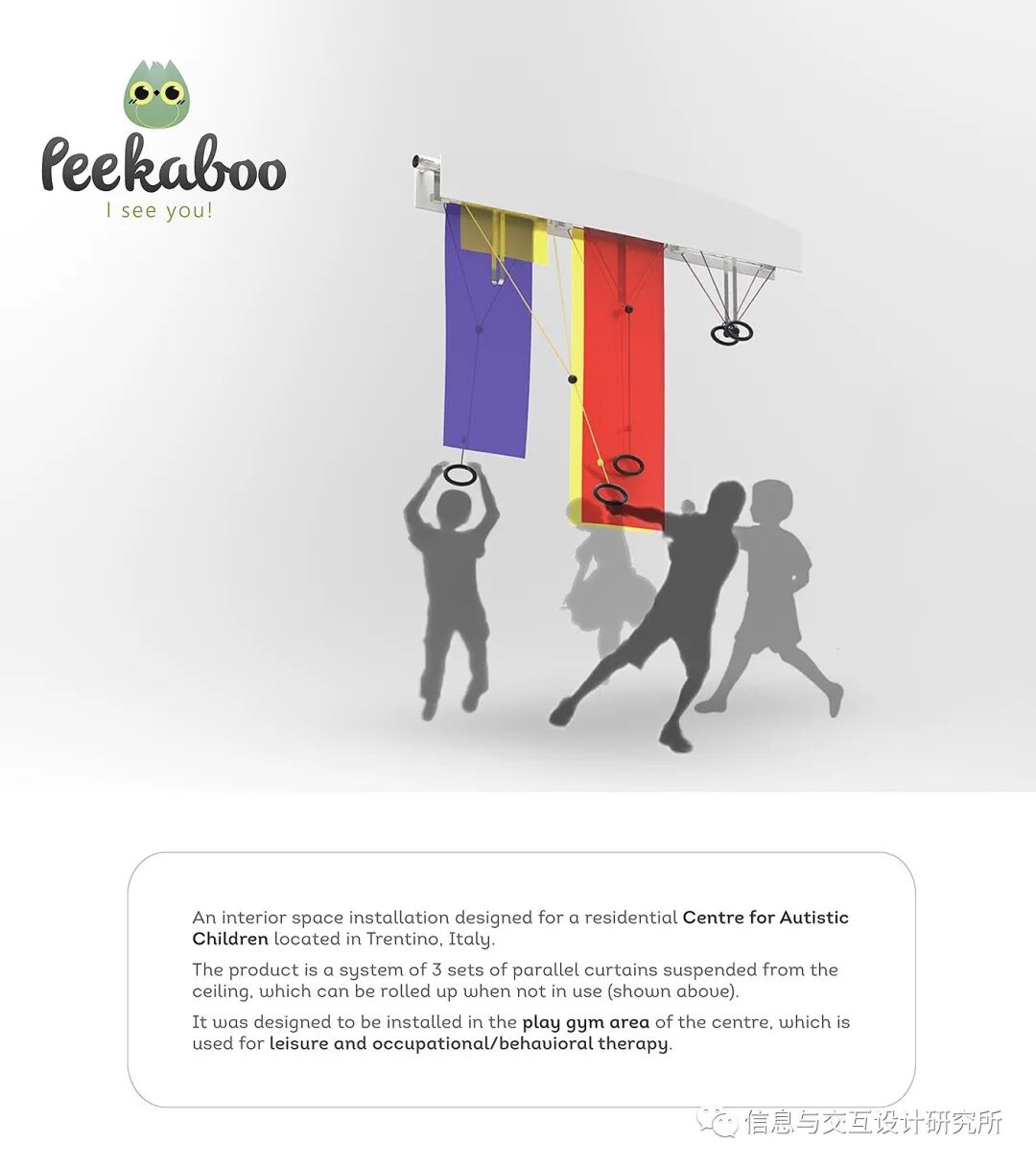 Peekaboo为位于意大利特伦蒂诺的自闭症儿童住宅中心设计的室内空间装置。该产品是由3套平行窗帘组成的系统,可在不使用卷起。它被设计为安装在该中心的游戏健身区,用于休闲和职业行为治疗。