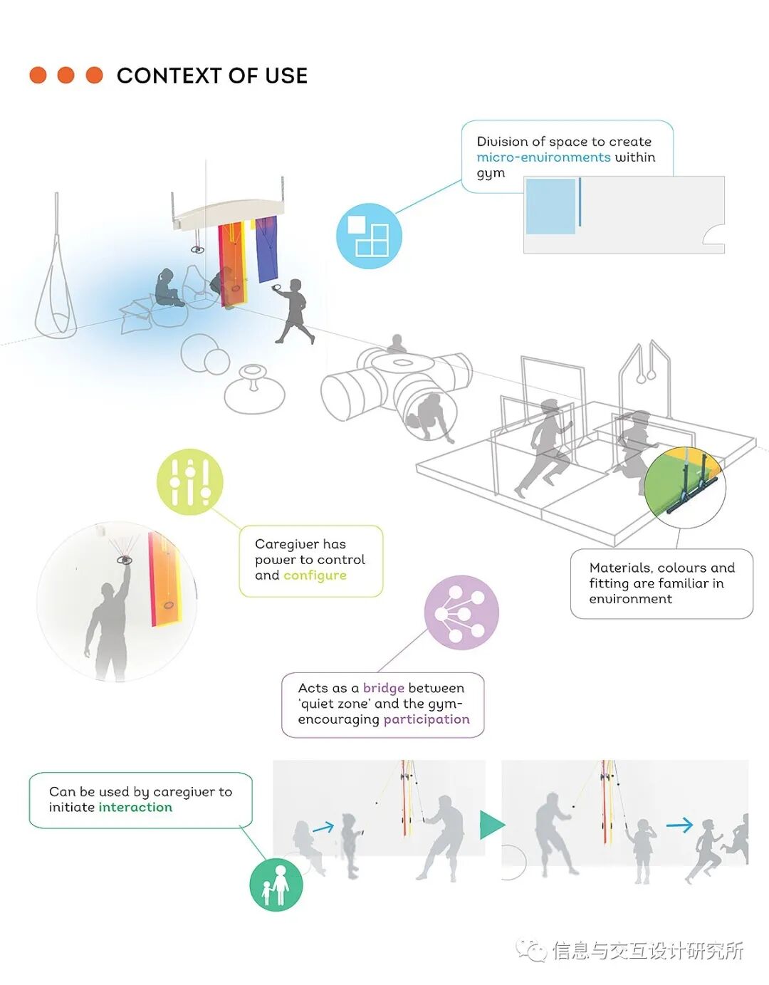 上述图展示了Peekaboo室内空间互动装置的结构、材质的说明;通过图片简单的阐述关于该装置的使用场景及使用流程。