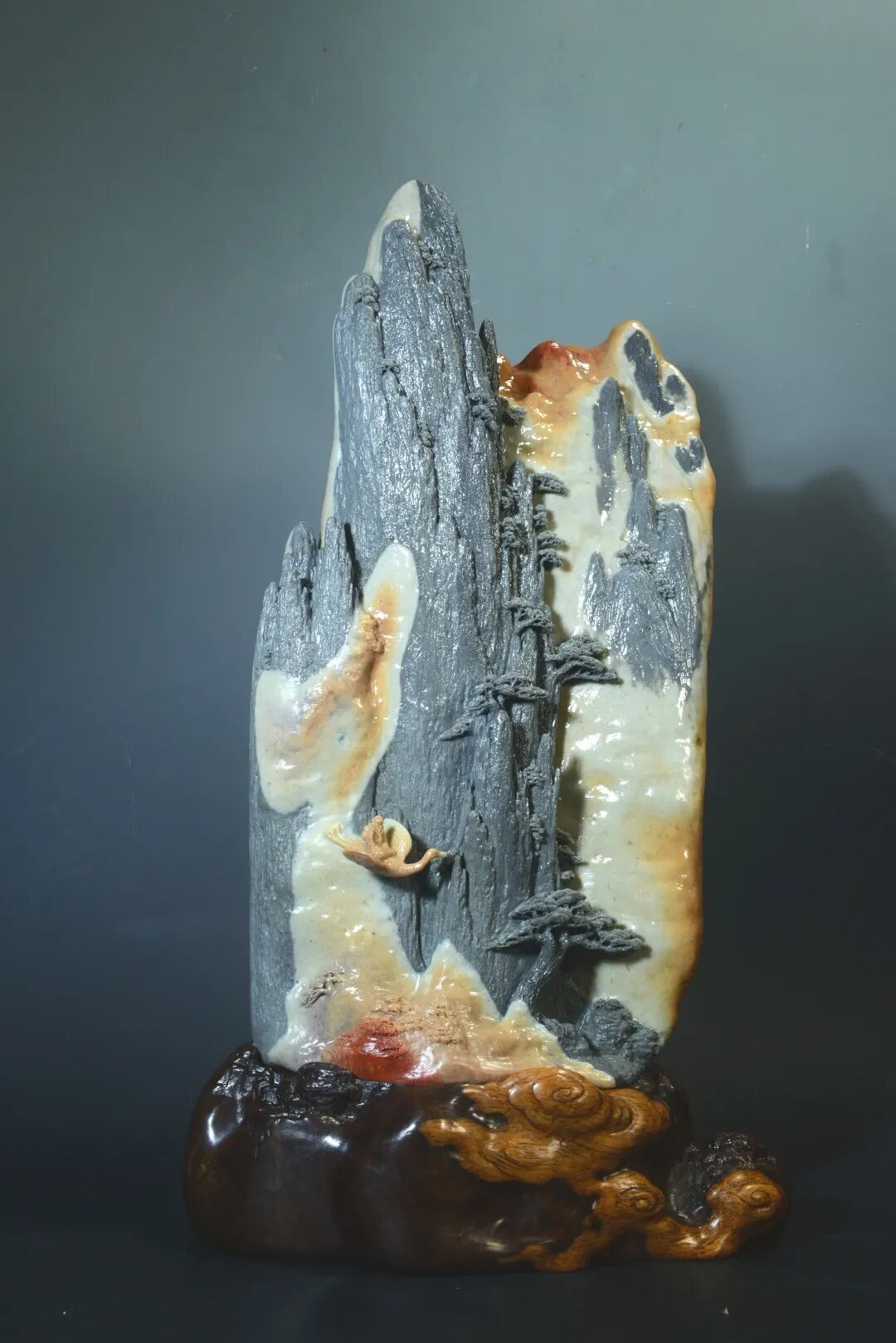 《桃花源》则是他山水创作的体现。思路源于那永和九年,会稽山阴的兰亭雅集之美感。灰白的山体与赭色的树木花草彼此映照,精细的镂空雕刻体现高超的技术。山体表面石材色彩的变化,像极了山腰上缭绕的云雾,在坚硬的石头上呈现出轻盈灵动、柔软模糊的效果。“桃花源”的命名,也蕴含了现代人对于诗画山水理想之境的向往。这座桃花源,仿佛一幅立体的中国山水画,叶品勇以刀为笔,在三维空间中“刻画”出水墨长卷。