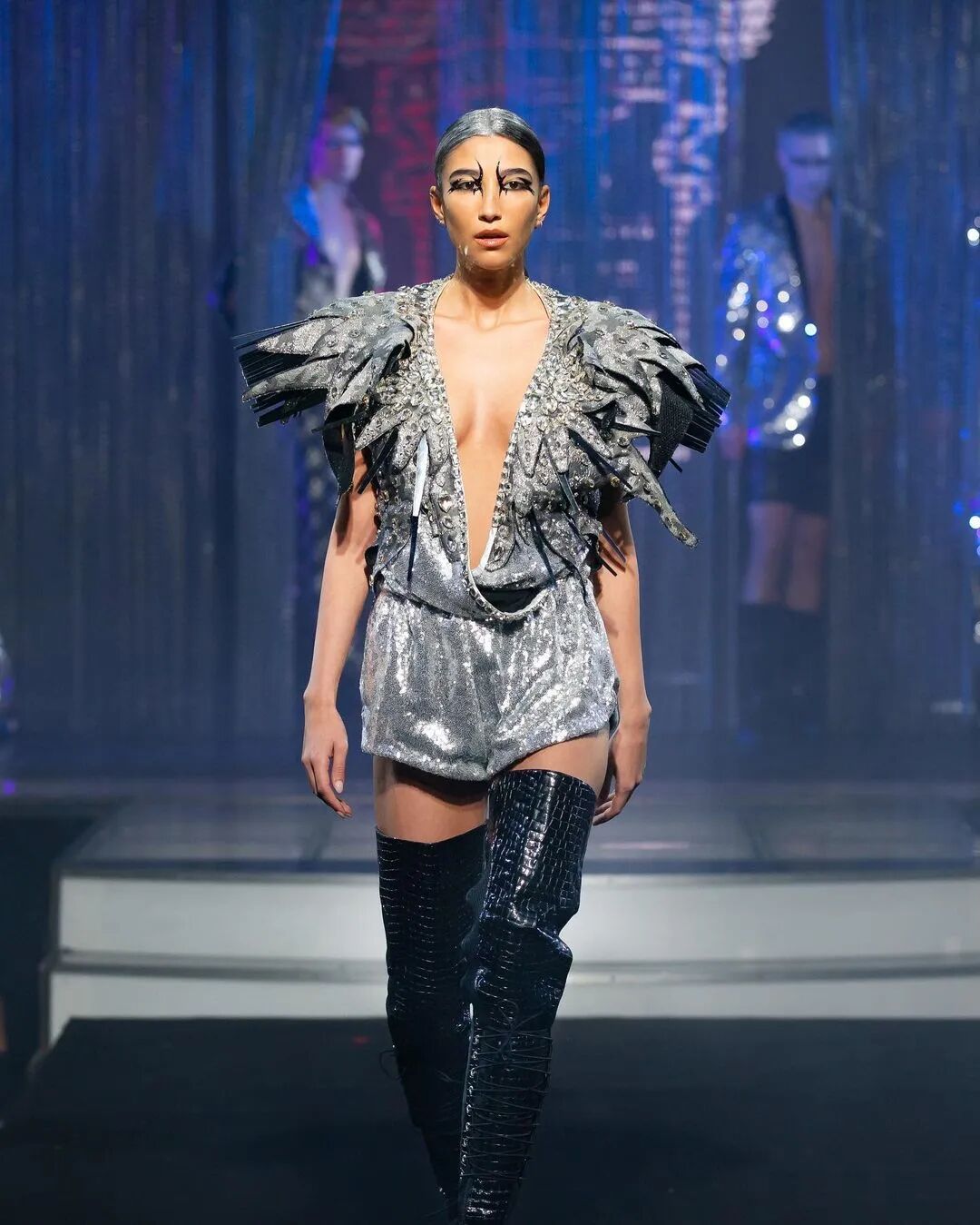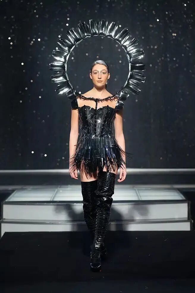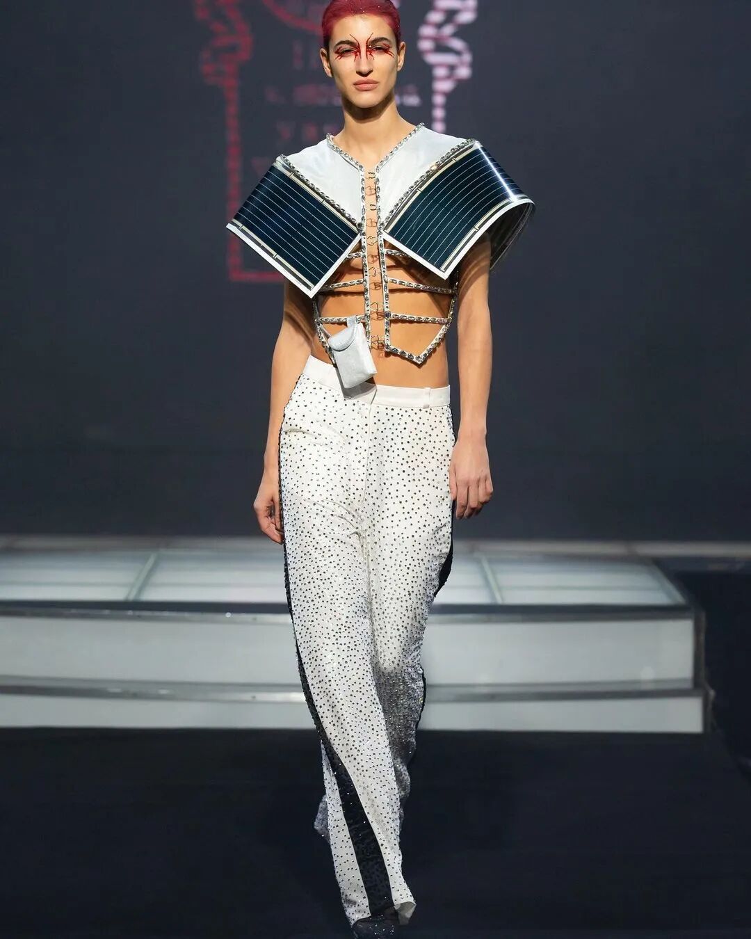 On Aura Tout Vu2023 SS高定系列,是基于我们问自己的一个存在主义问题:人类能否转向自己并利用自己的资源来创造自己的能量?设计师认为新的技术时装,比如将极薄且灵活的光伏元件以及压电元件集成到时装,每个人都可以在自己的小范围内生产自己的能源并减少共同的电力消耗。