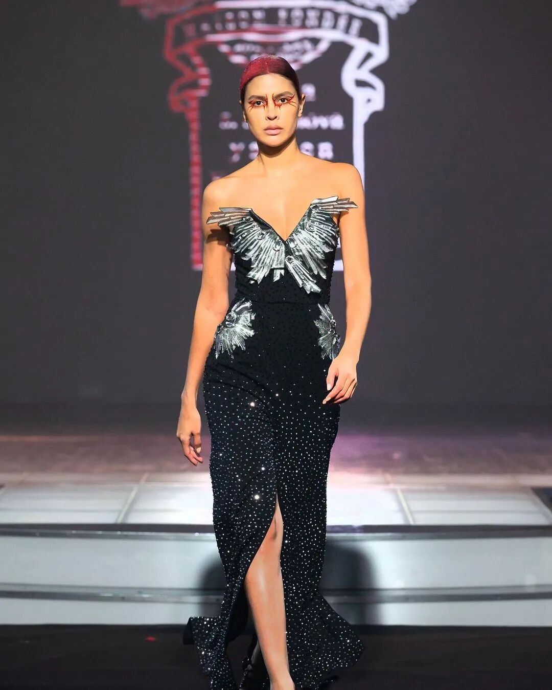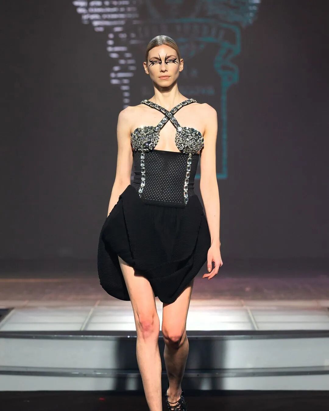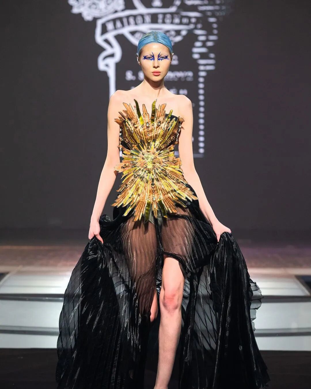法国品牌On Aura Tout Vu 是由两位保加利亚裔设计师Yassen Samouilov和Livia Stoianova1995年创立,通过其奢侈和原创作品脱颖而出,每年都会参加巴黎高定时装周。2023春夏高定,品牌把目光转向现在的能源危机问题,通过元素的混杂来打造优雅与活力并存的光伏时尚系列。