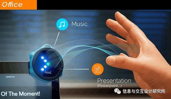 Bixi是Bluemint团队研发的一款手势遥控器,外形就像手表表盘。内部装有光学传感器,能够分辨出不同的手势动作。通过蓝牙与智能手机连接, 连接后在APP操作又通过wifi与其他智能设备通讯。连接成功后,就能通过上下左右挥动手掌对电子产品进行操控,手势在25CM范围内可根据需要任意设置。