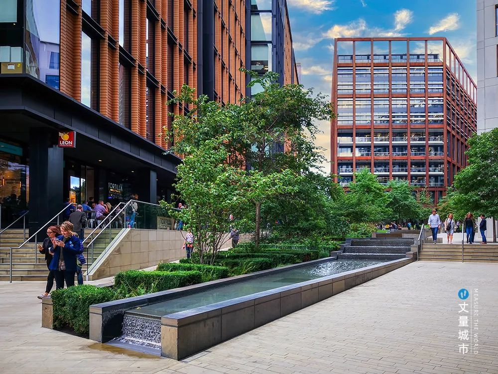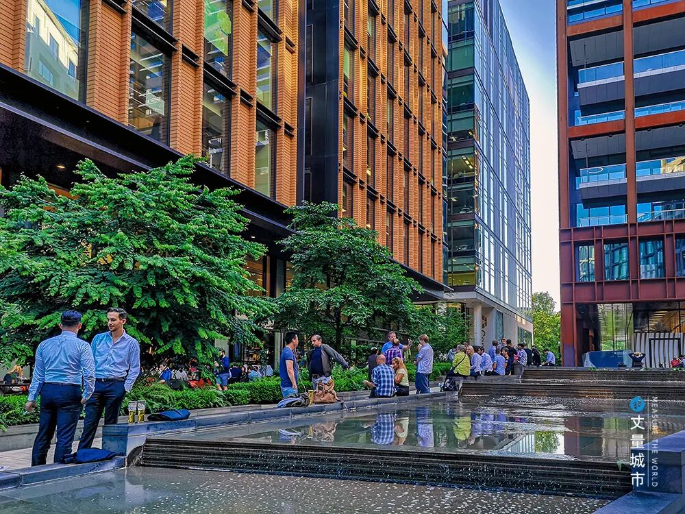 潘克拉斯广场位于写字楼群之间,以跌落式水景串联空间,通过种植草坪、放置座椅,成功地在商业区域中打造出一片休闲绿地。使人漫步在高楼林立之间,也能感觉到生机盎然。作为入驻企业,谷歌公司就表达了对于街区内公共空间的喜爱。