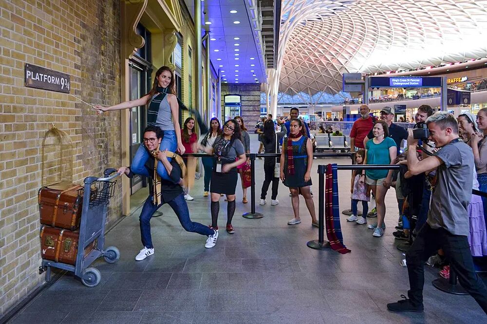 ▼ 游客在9¾站台打卡拍照(来源:Wikipedia)