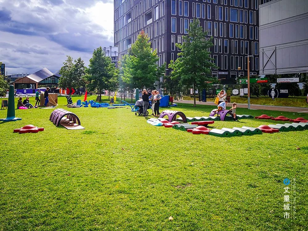 公园中有专为儿童设计的「软游乐区」——这不是固定的游乐设备,而是由许多有柔软触感的形状组成,孩子们可以发挥想象,将其随意组合在一起,自己动手搭建出隧道、房屋等各种有趣的游戏场景。