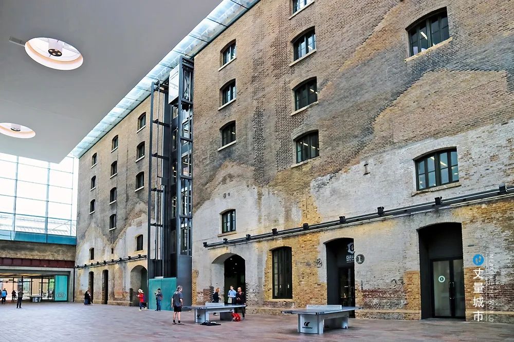 类似的,圣马丁艺术学院的教学楼,由三个谷仓仓库拼合而来;运河边极具艺术氛围的开放公共空间储气罐公园,保留了支撑废弃储气罐的铸铁钢架,成为了片区的景观地标……