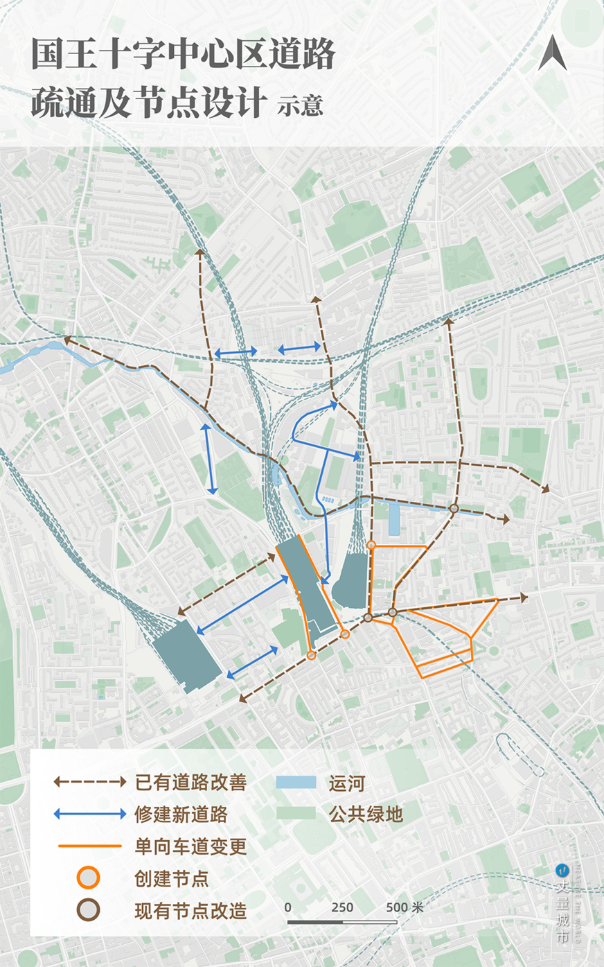 街区在南北向新规划了从车站广场至北部住宅区,跨摄政运河的人行主干道,引导人流从车站深入街区北部,东西向沿摄政运河新修建了贯穿东西的滨水步道。