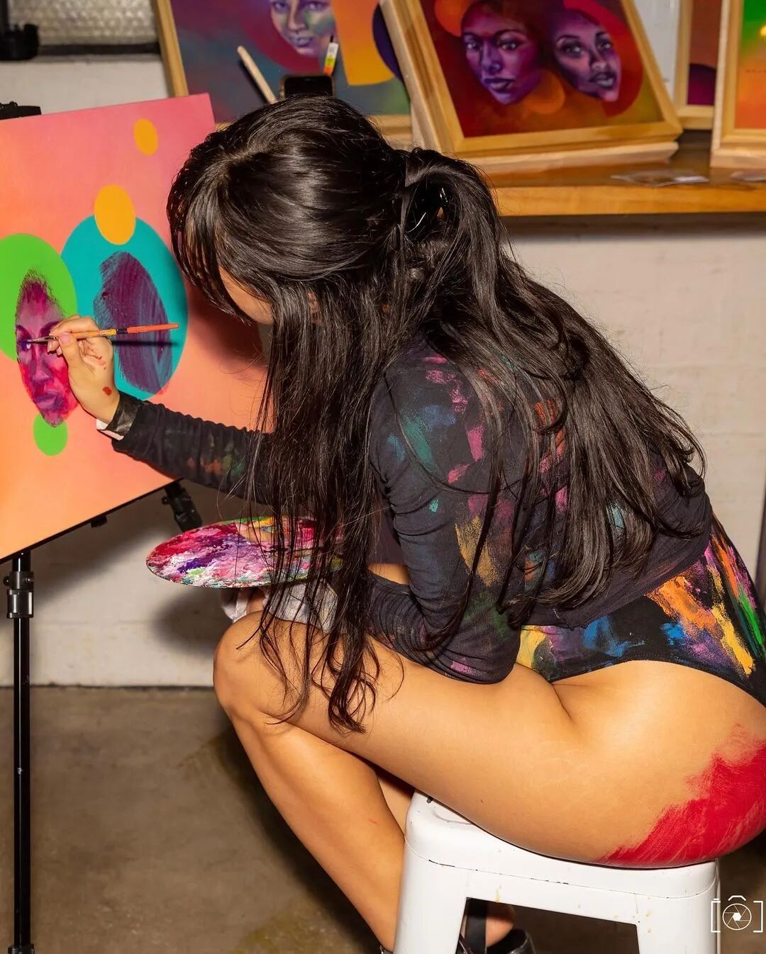 Savana Burdick-Perez用自己的臀部做富有表现力的肖像画,先将画好的臀部压在画布上,然后在上面直接画两个肖像。她尽可能地保留印记,且记录整个过程,最后再把视频作为行为艺术上传到社交媒体平台。