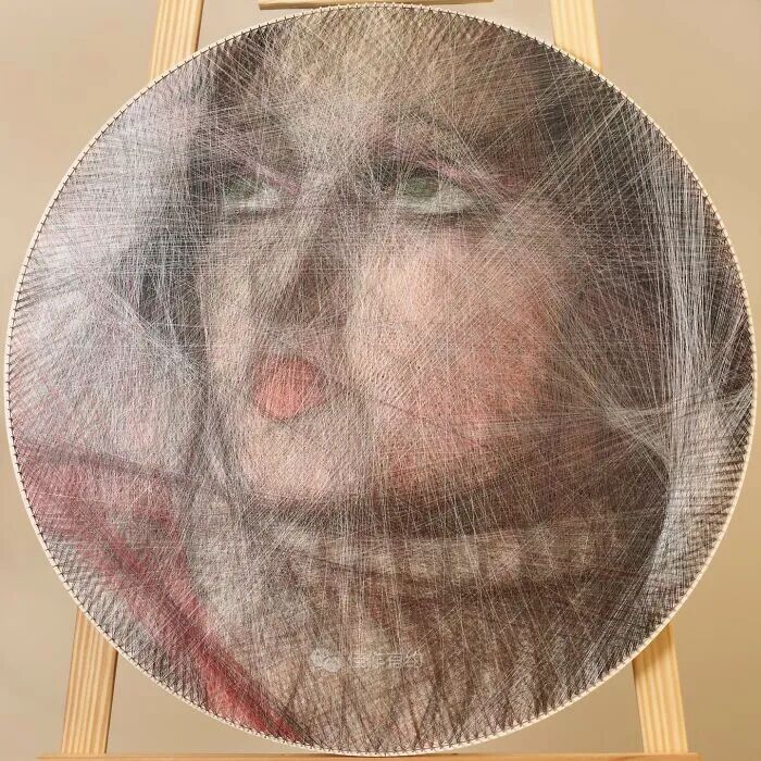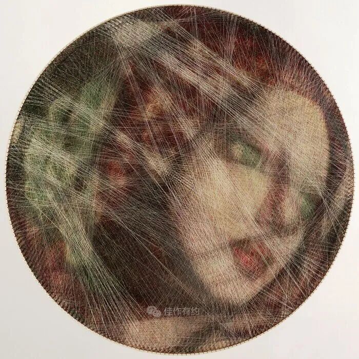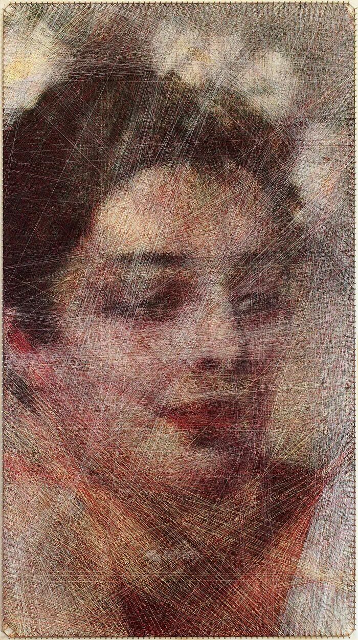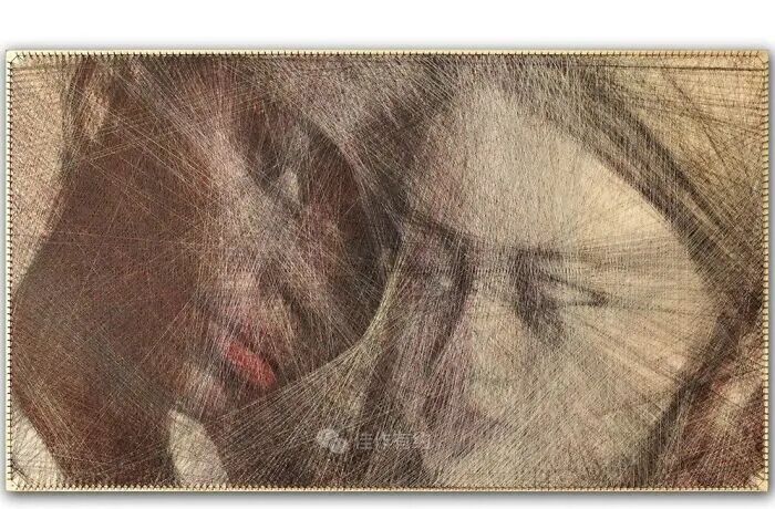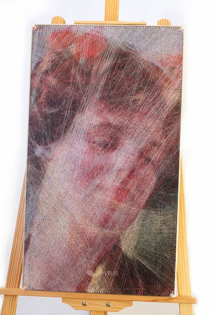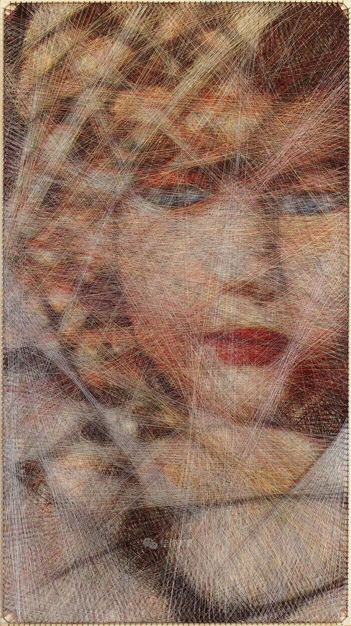 我们的每件作品都只有三个固定组件:一块胶合板、数百个沿其边缘放置的钢钉,以及在它们之间绘制的各种颜色、类型和厚度的数英里交叉线。我们不使用任何绘画技术,只有线程专门负责创建整个图片。