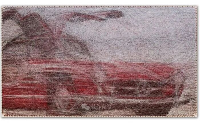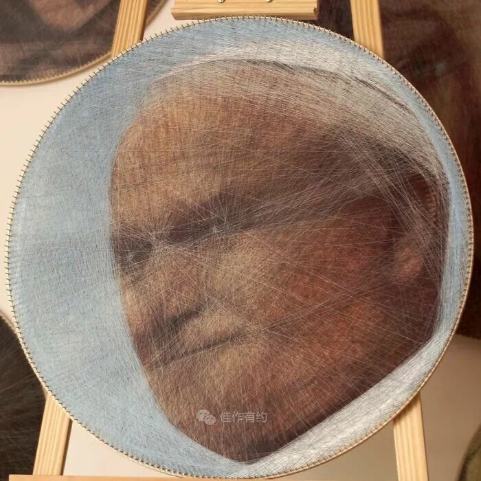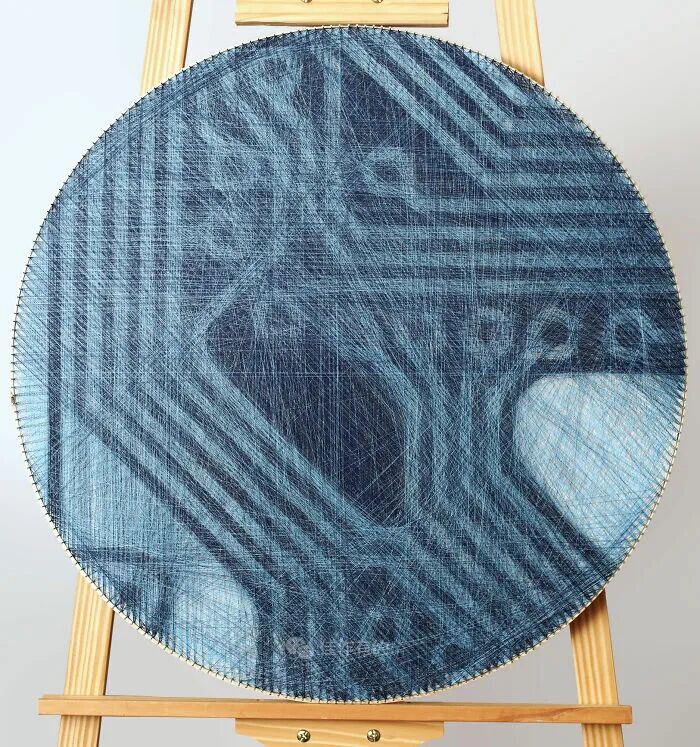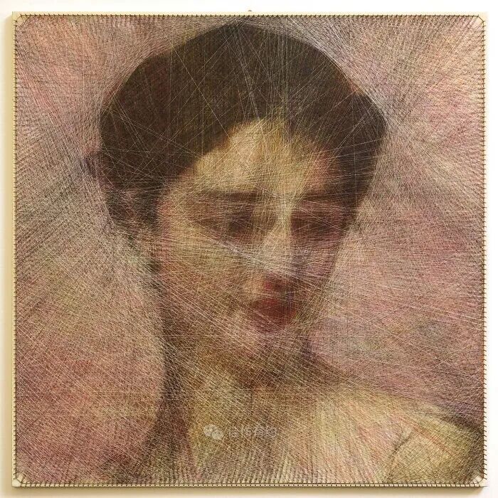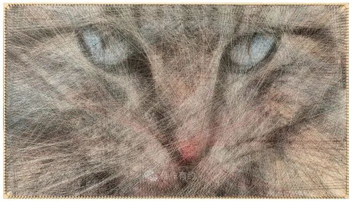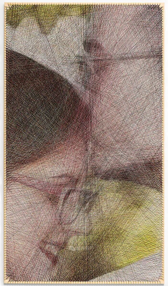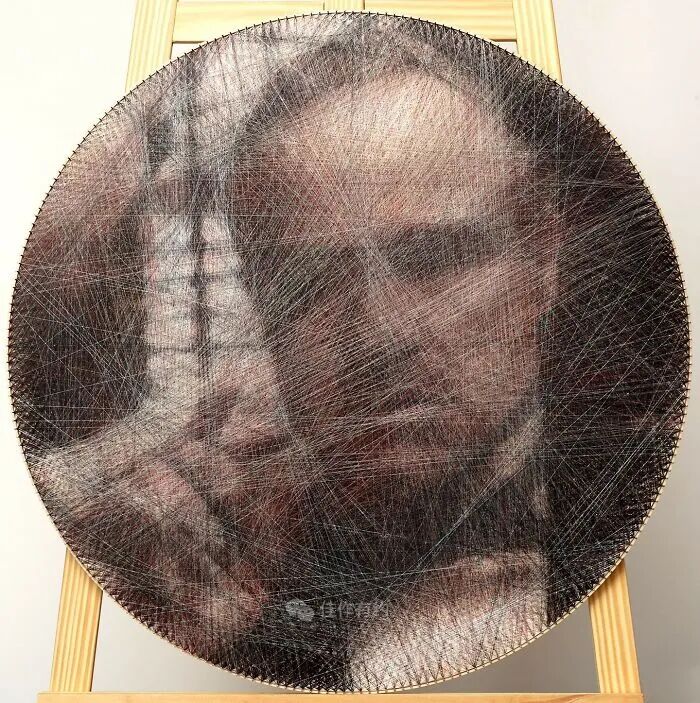 我们的每件作品都只有三个固定组件:一块胶合板、数百个沿其边缘放置的钢钉,以及在它们之间绘制的各种颜色、类型和厚度的数英里交叉线。我们不使用任何绘画技术,只有线程专门负责创建整个图片。