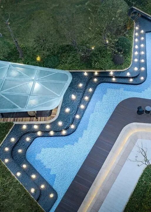 幽静雅致的墨绿色映衬镜面水池反射的粼粼波光