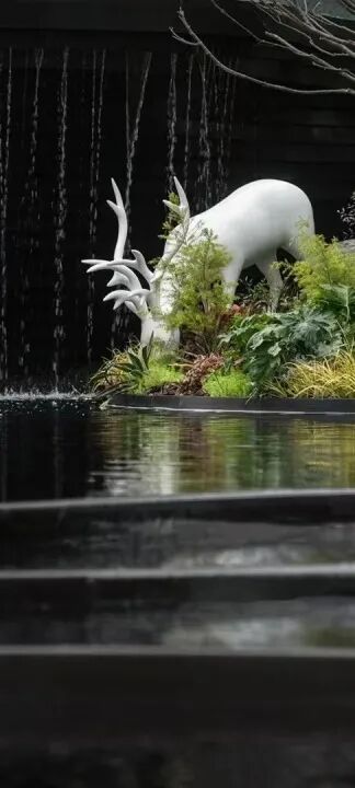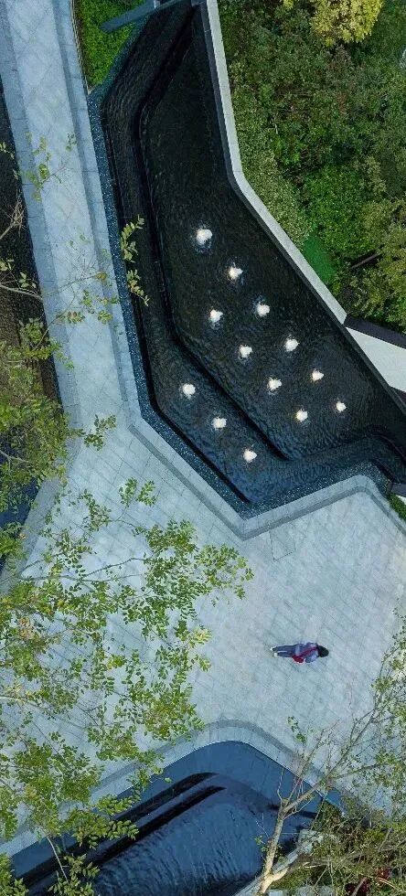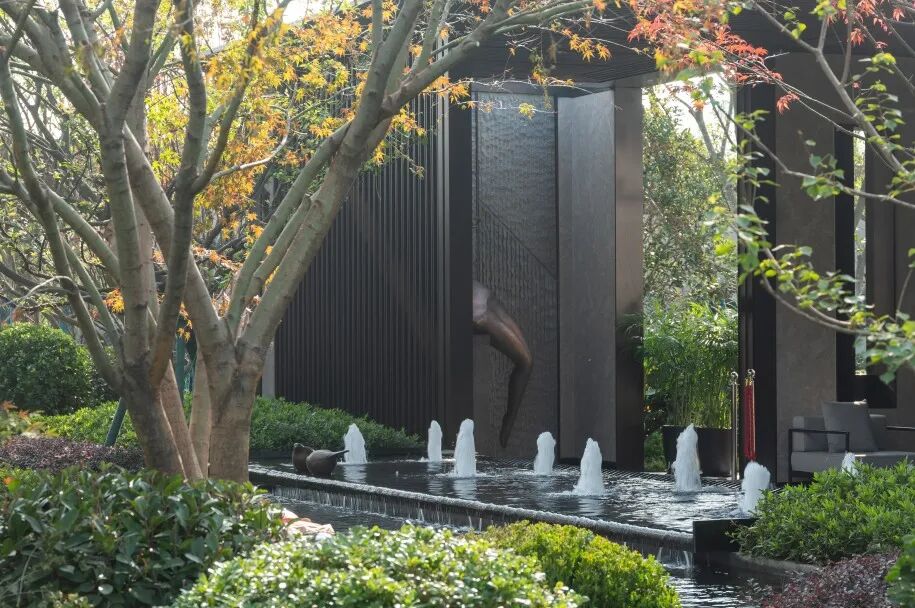 景墙潺潺的的叠水与脚下沙沙的砾石交响
