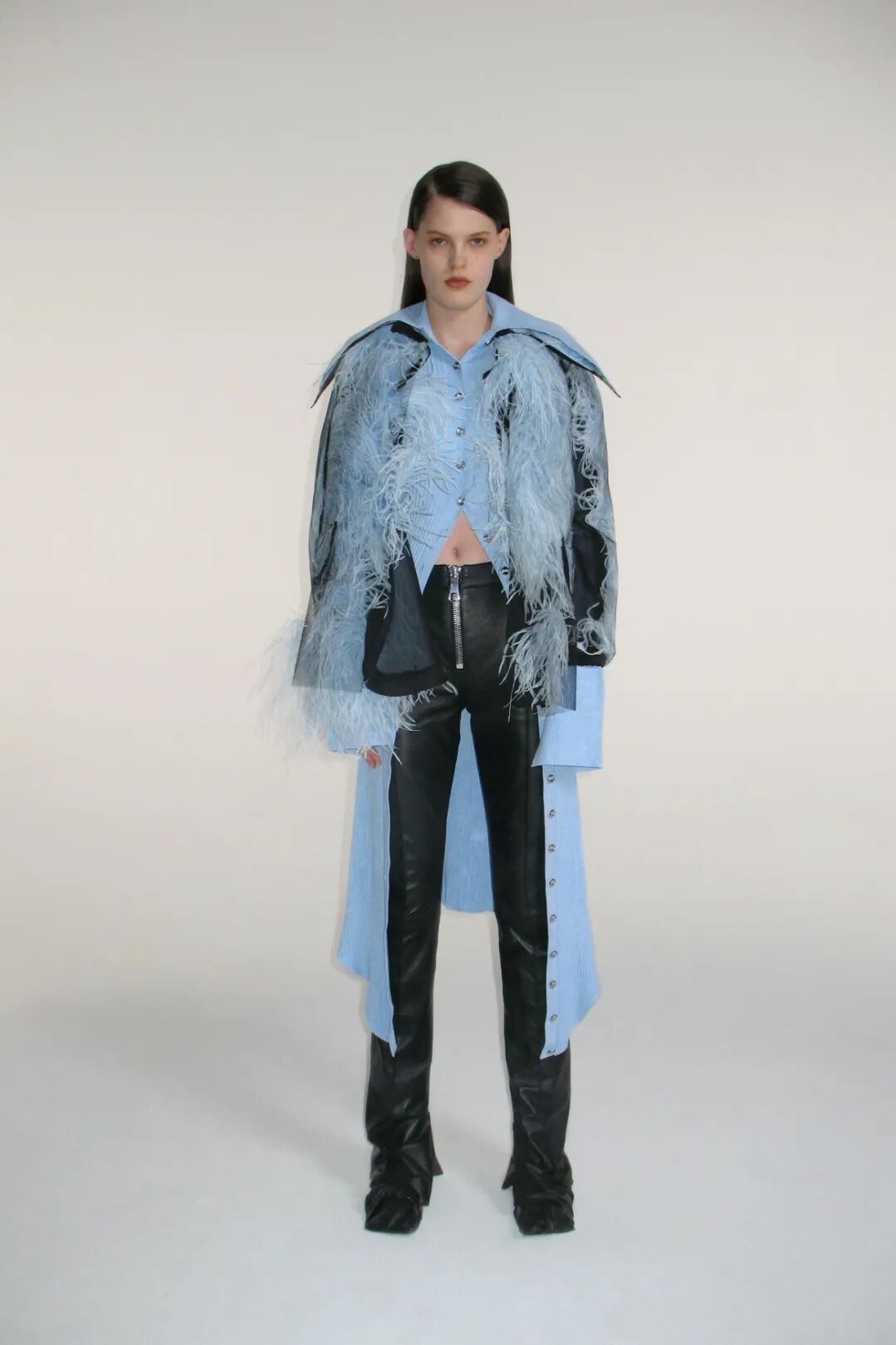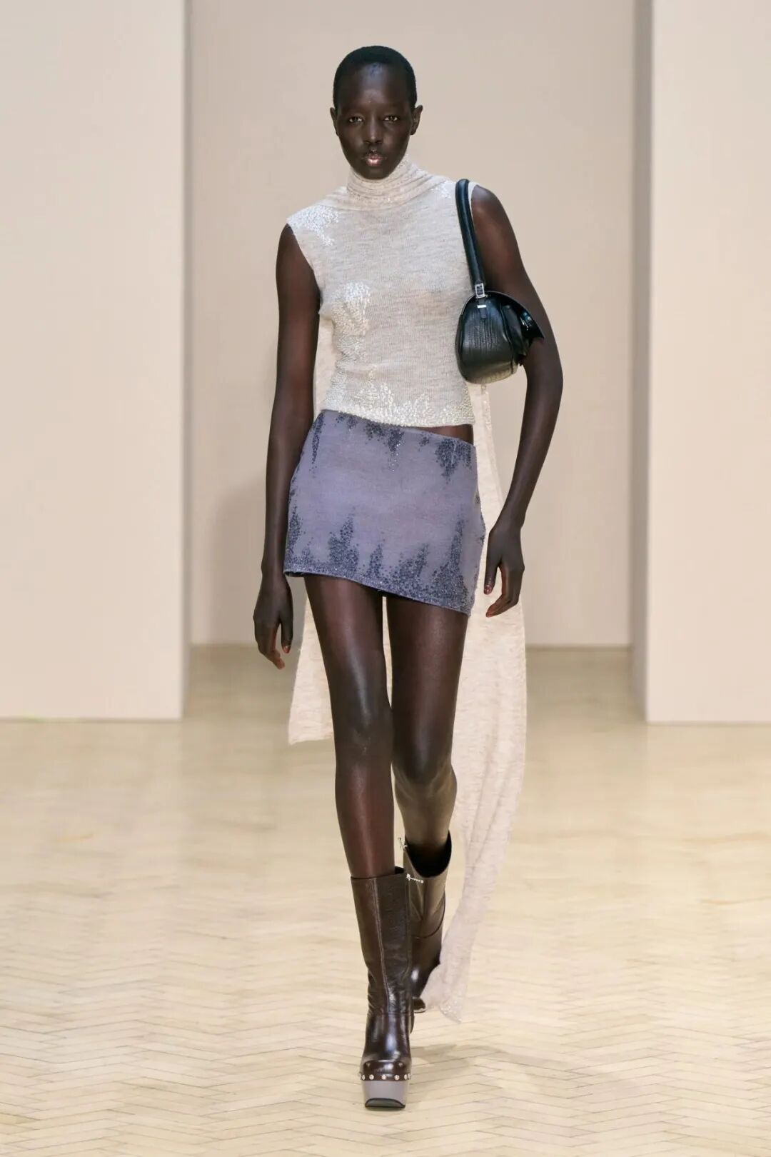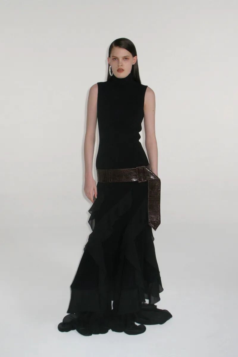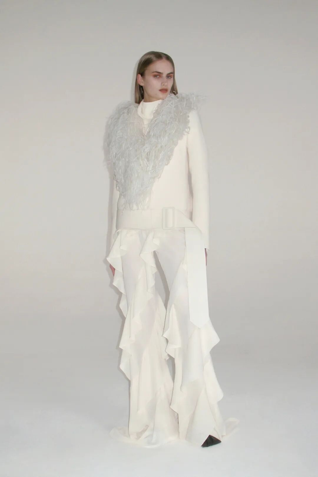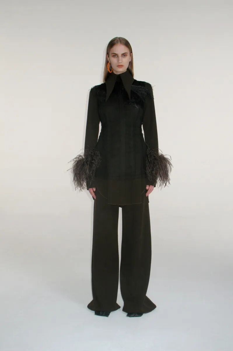 简约的奢华是品牌的一贯调性,舒适感设计也没有被遗忘。这组服装将16Arlington的标志性羽毛与针织进行混合,制成简单的修身上衣,系带衬衫以及过膝半裙,配以网眼丝袜,尽显舒适的性感。