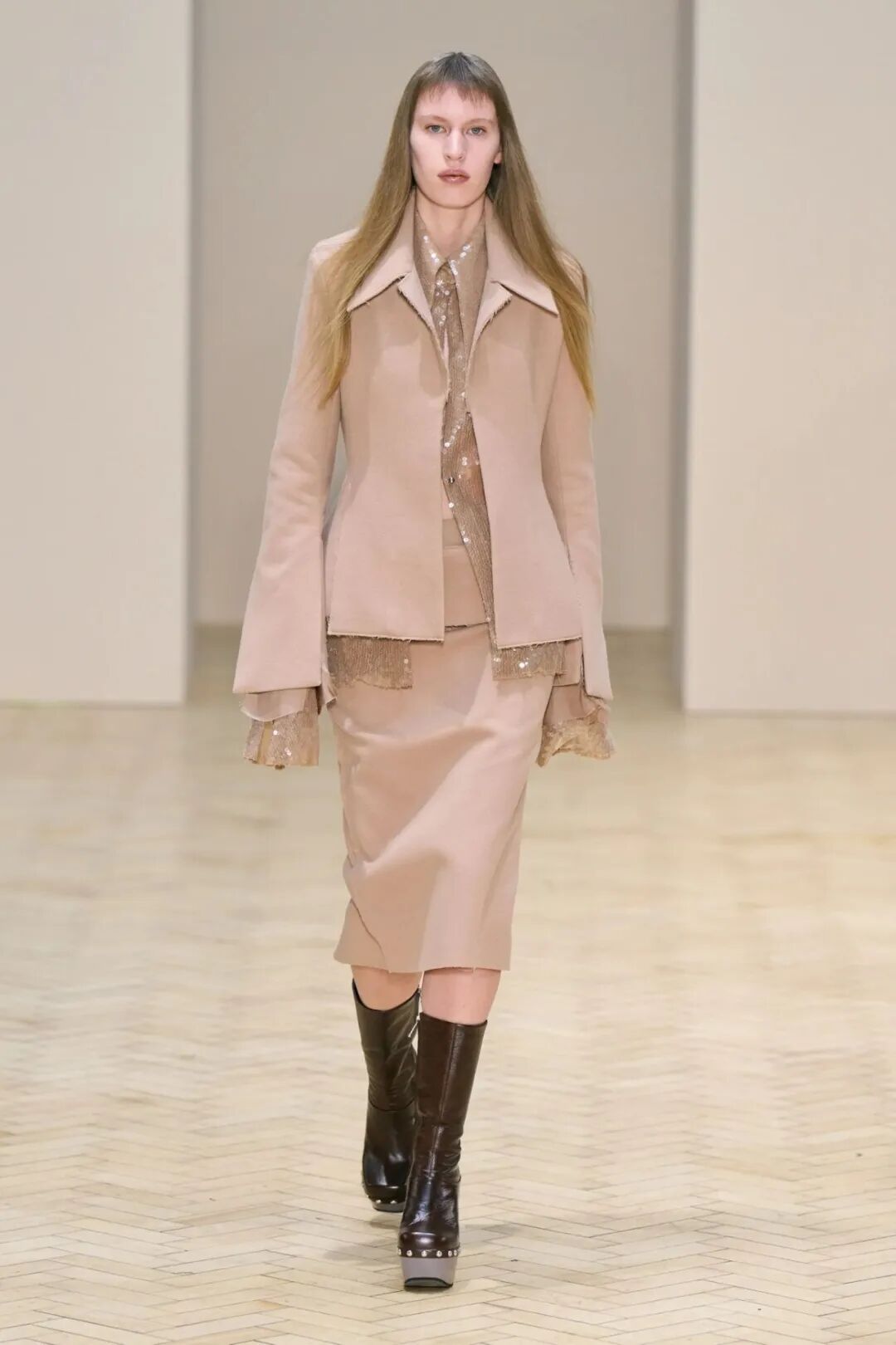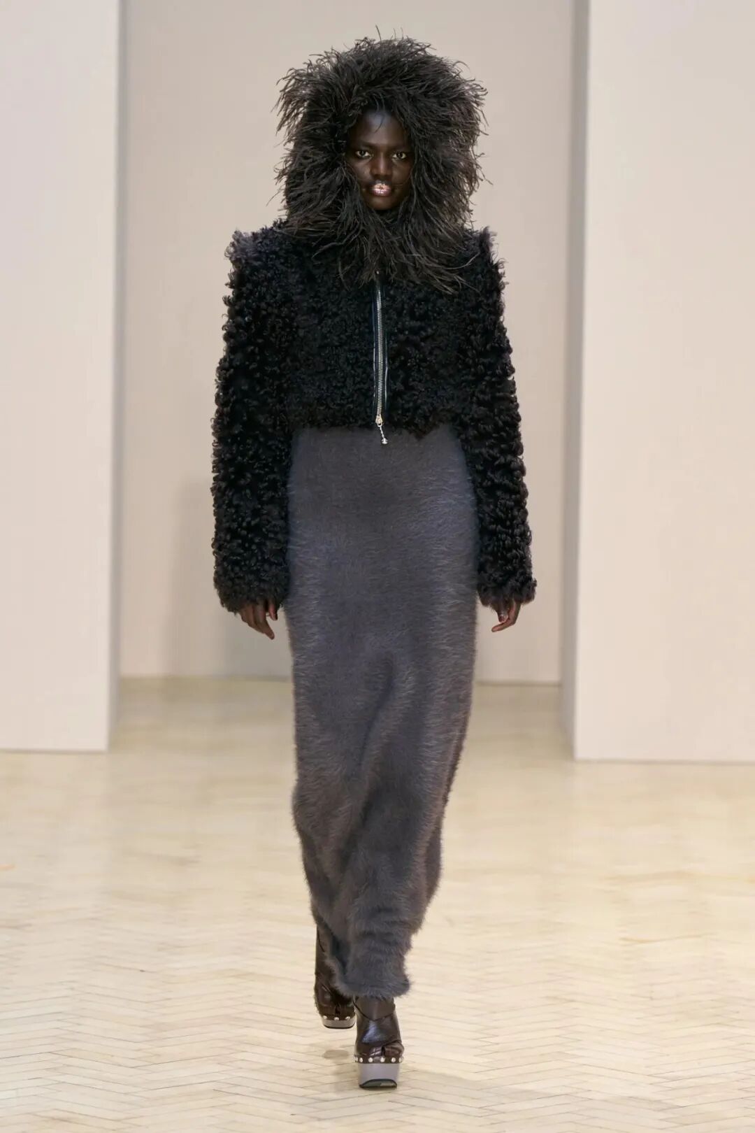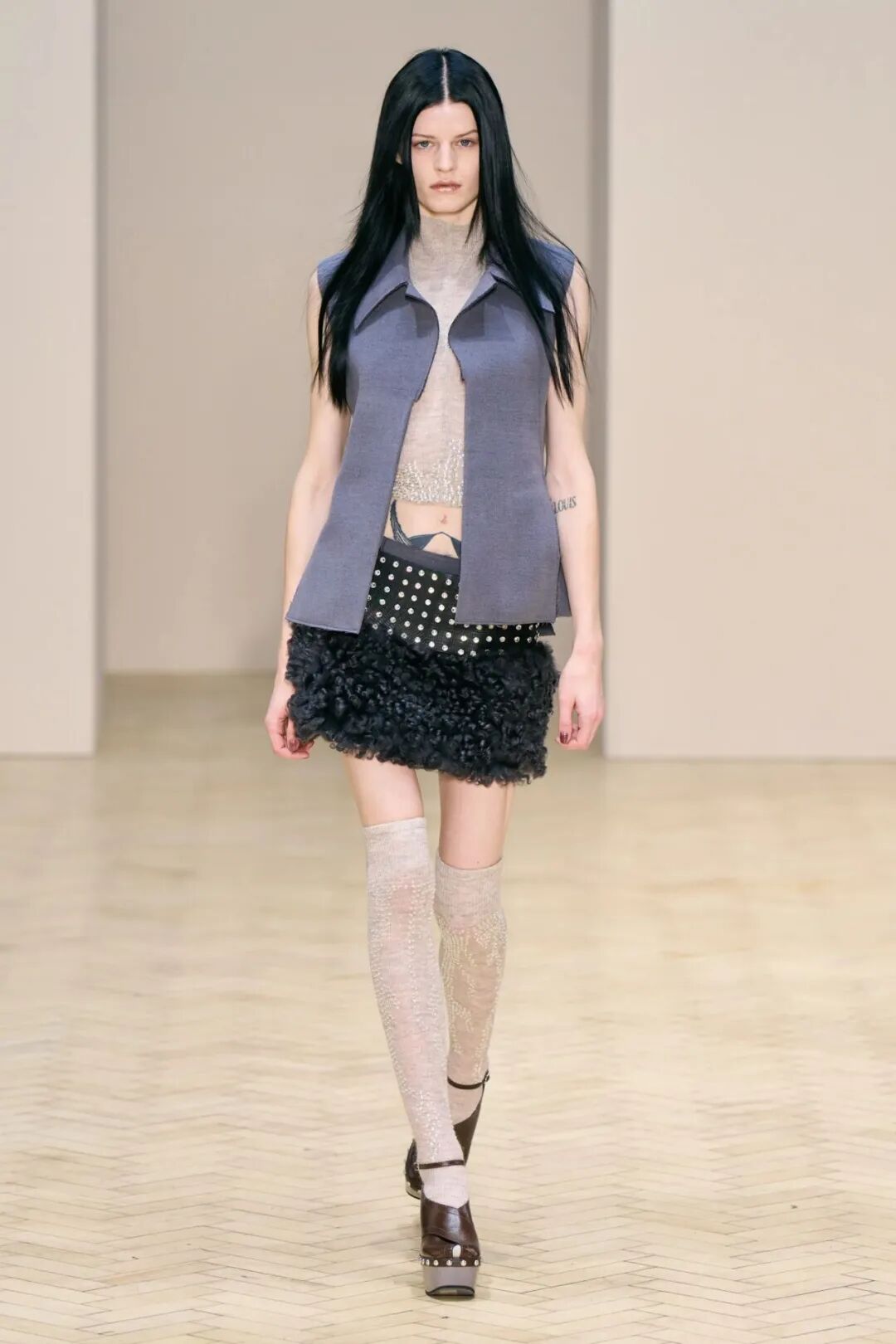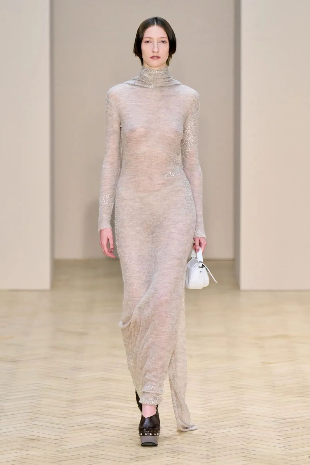 简约的奢华是品牌的一贯调性,舒适感设计也没有被遗忘。这组服装将16Arlington的标志性羽毛与针织进行混合,制成简单的修身上衣,系带衬衫以及过膝半裙,配以网眼丝袜,尽显舒适的性感。