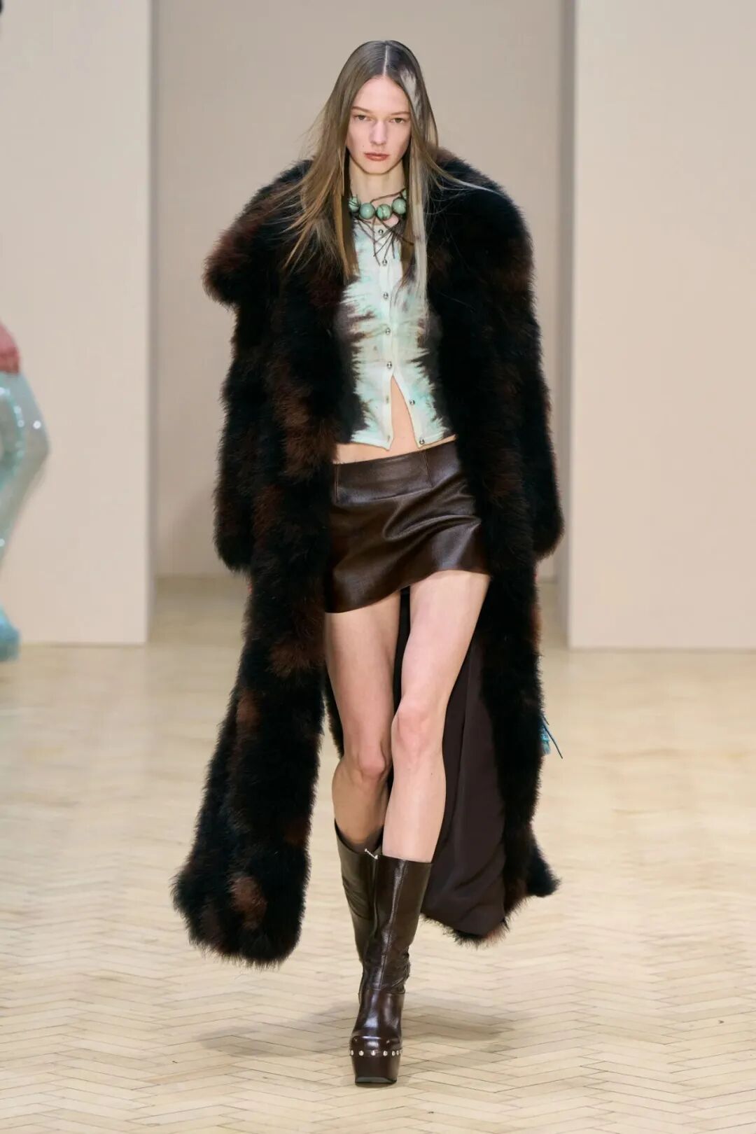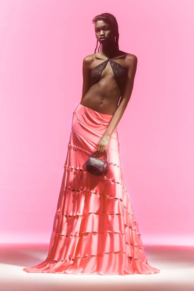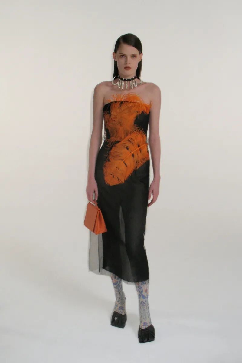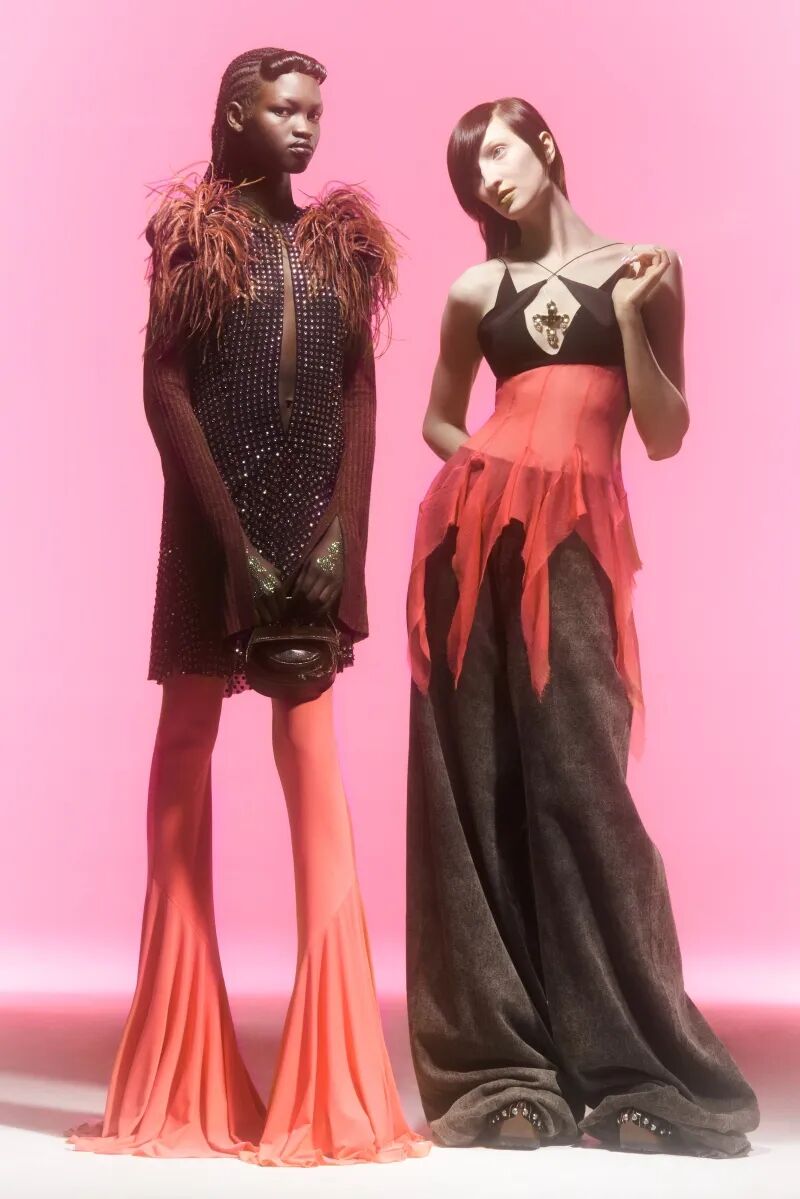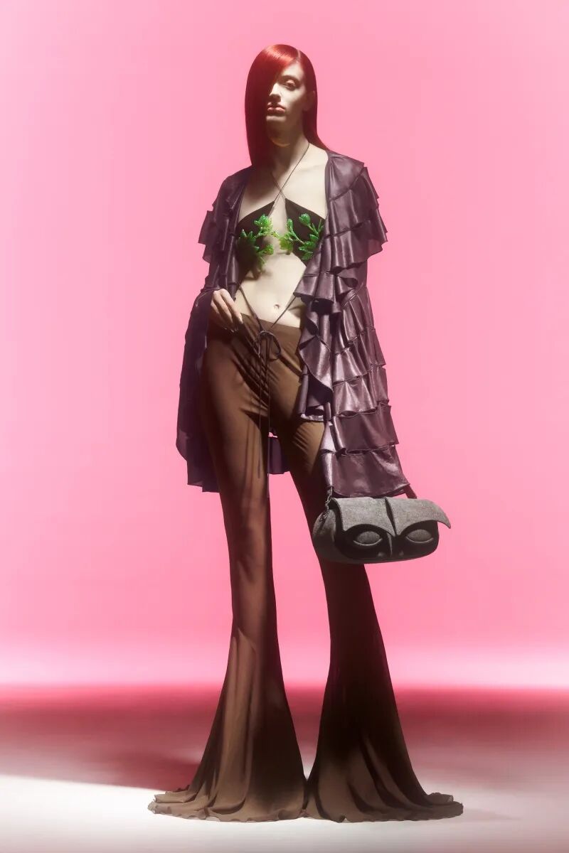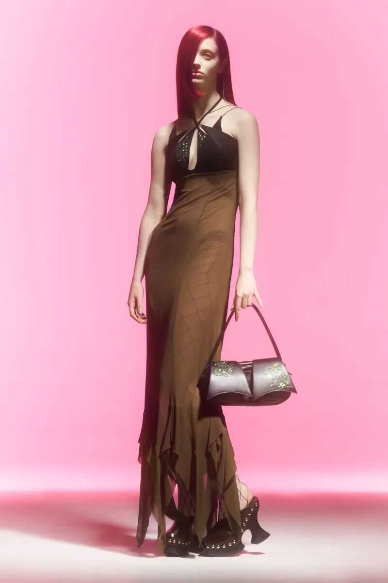 细节设计上,钩眼紧身衣、外露拉链和低垂宽腰带彰显90年代派对精神。硕大的耳坠模仿了品牌标志性的鸵鸟羽毛的弧度,将优雅和狂野描绘到了极致。