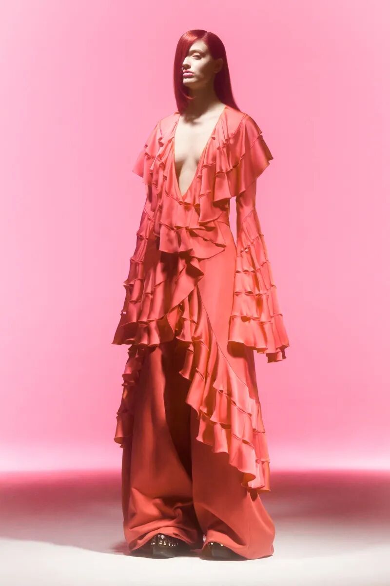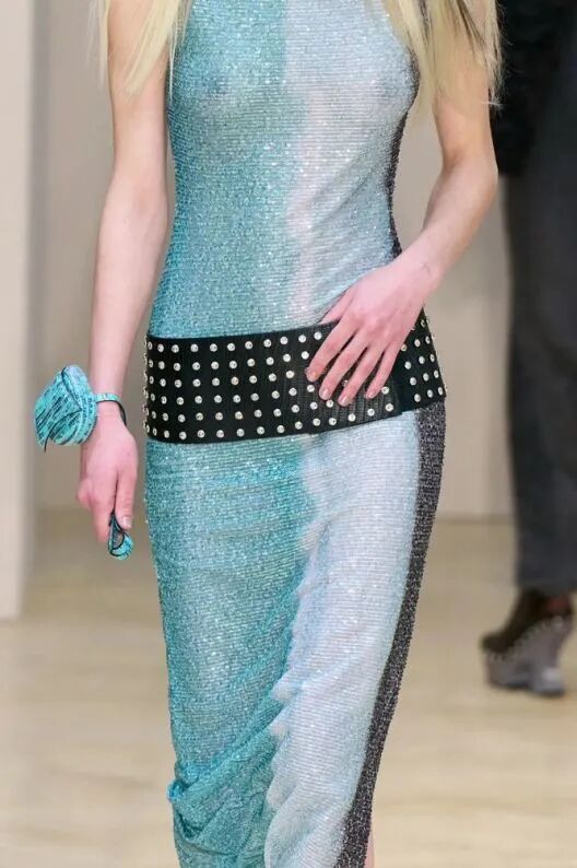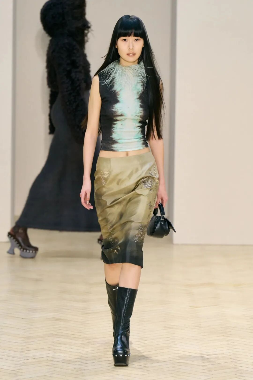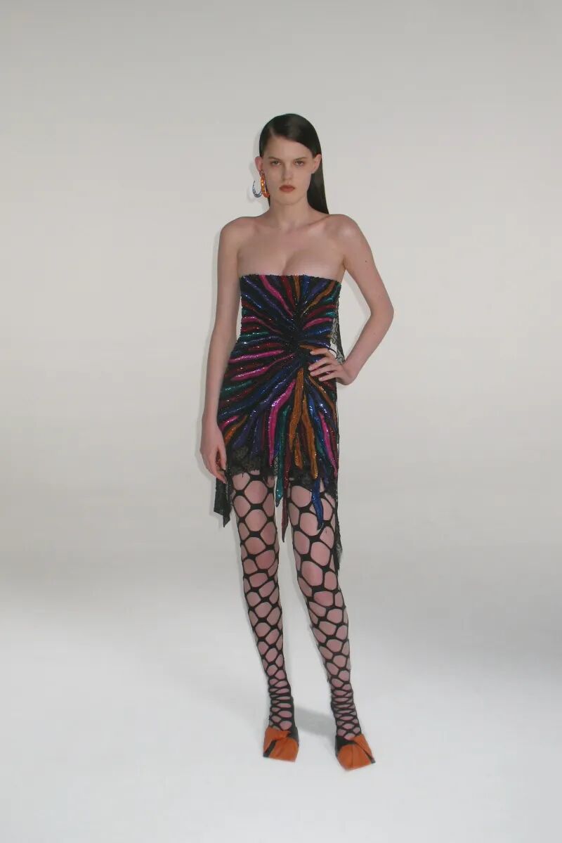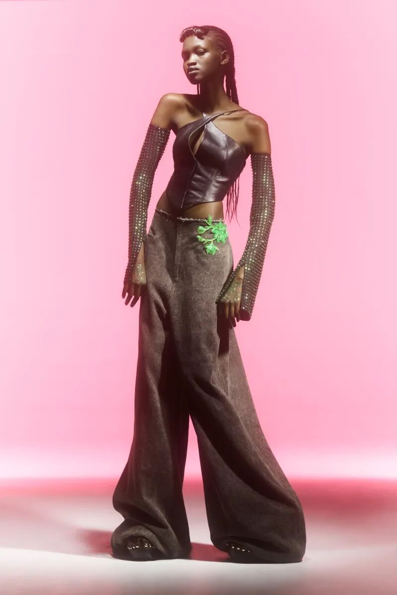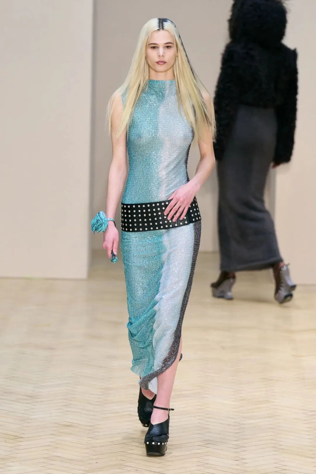 细节设计上,钩眼紧身衣、外露拉链和低垂宽腰带彰显90年代派对精神。硕大的耳坠模仿了品牌标志性的鸵鸟羽毛的弧度,将优雅和狂野描绘到了极致。