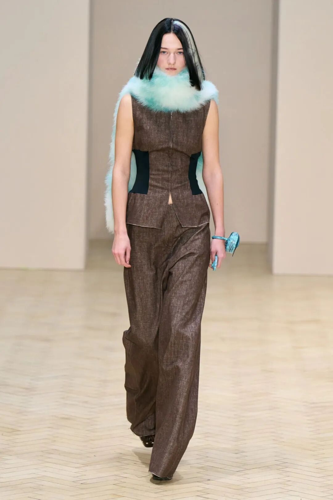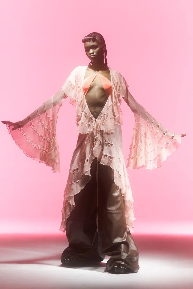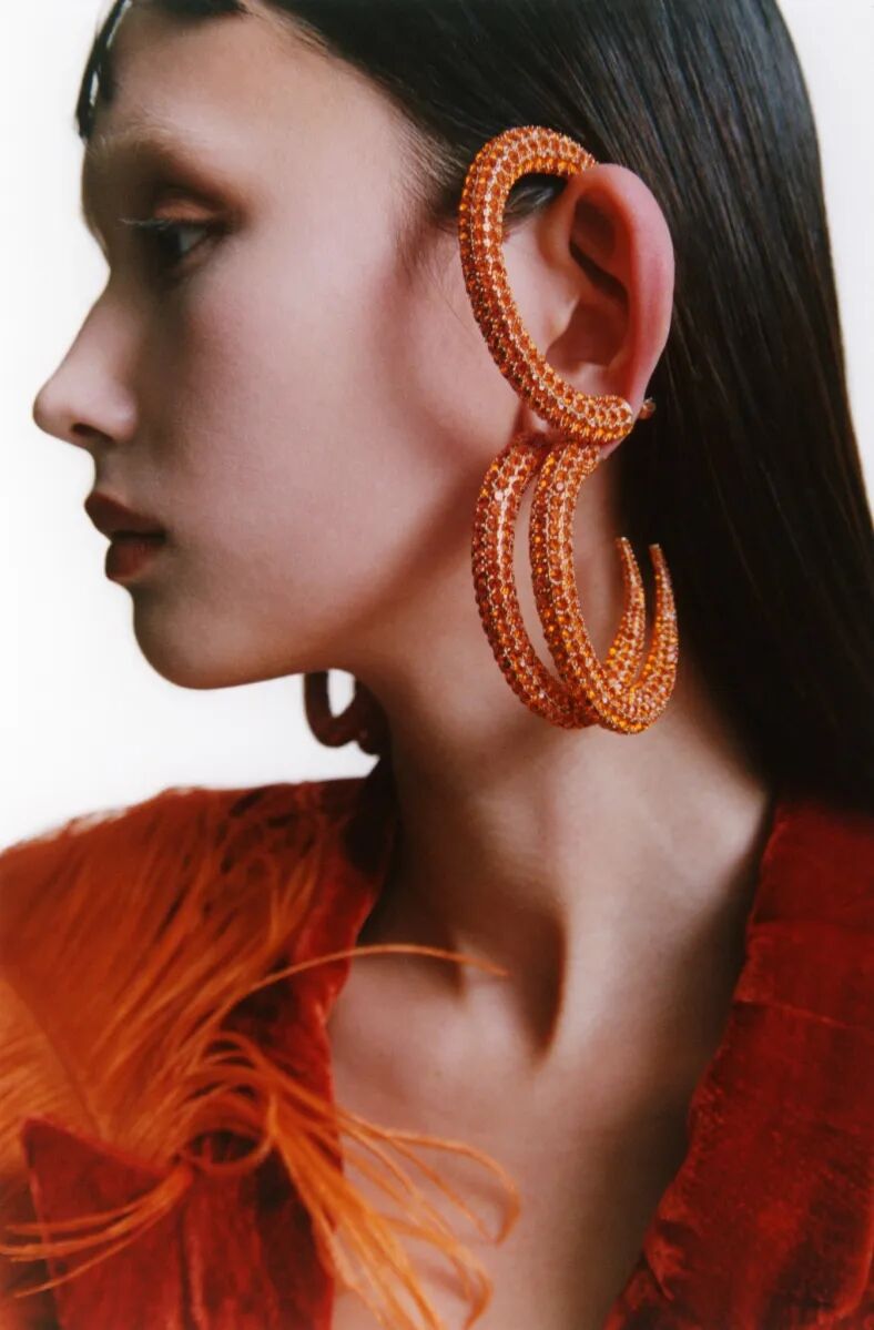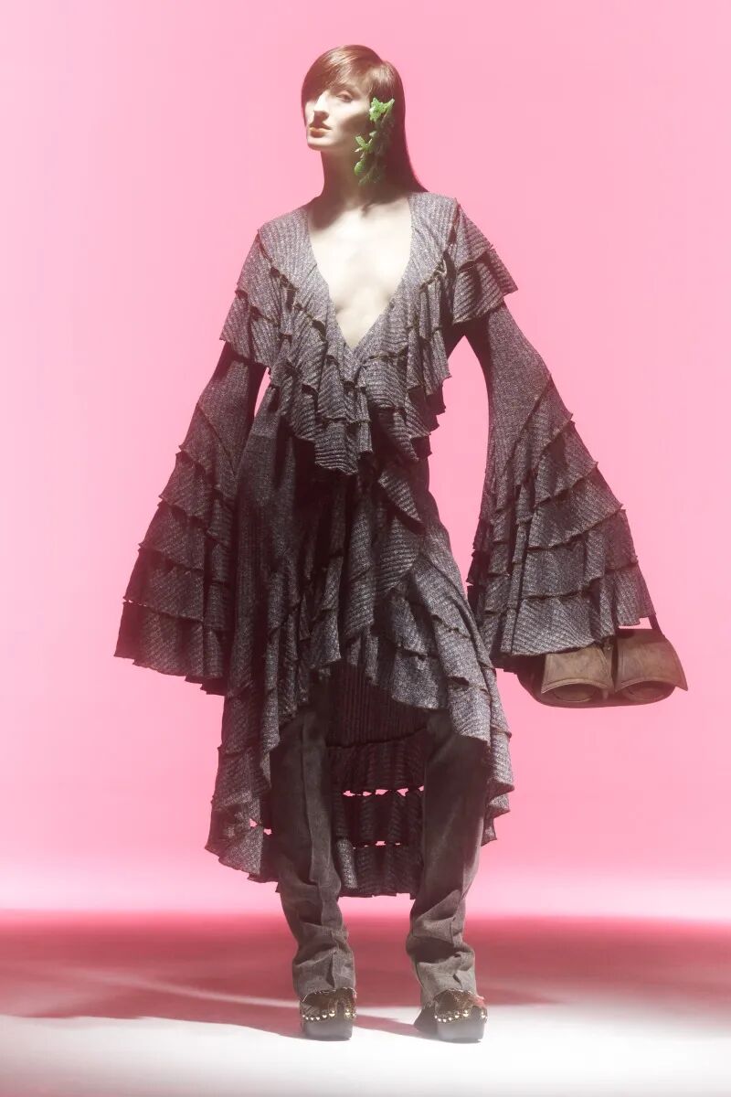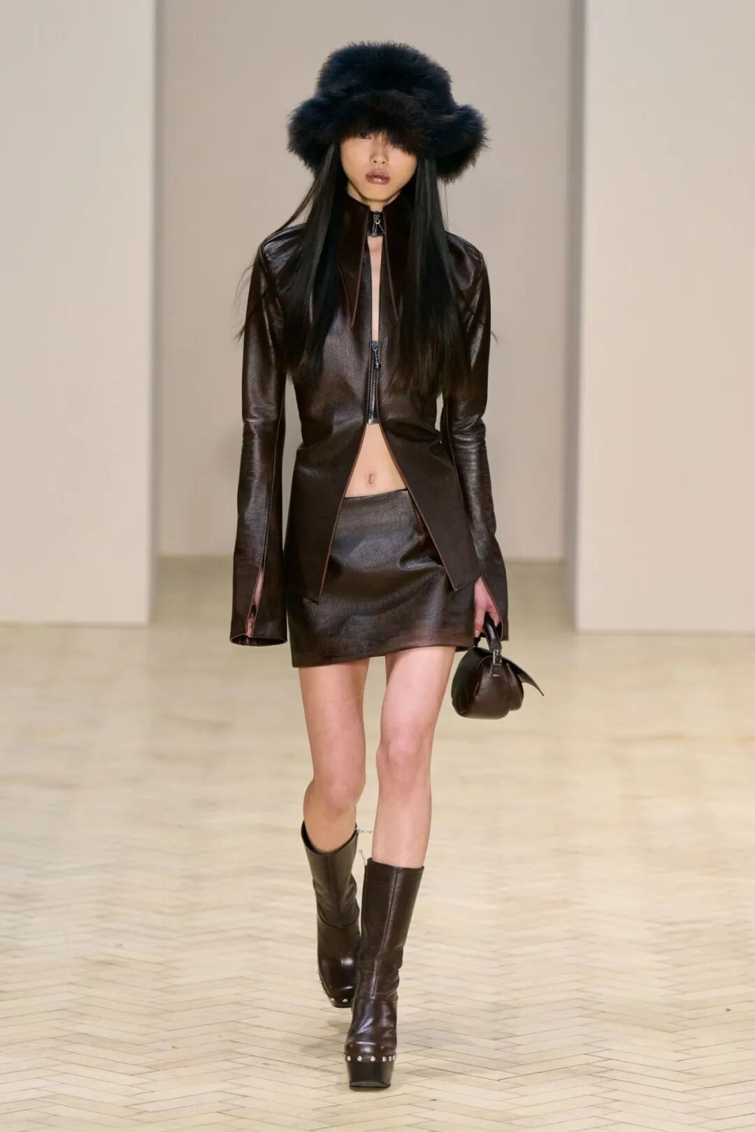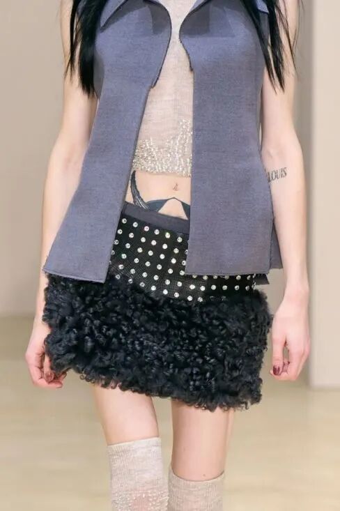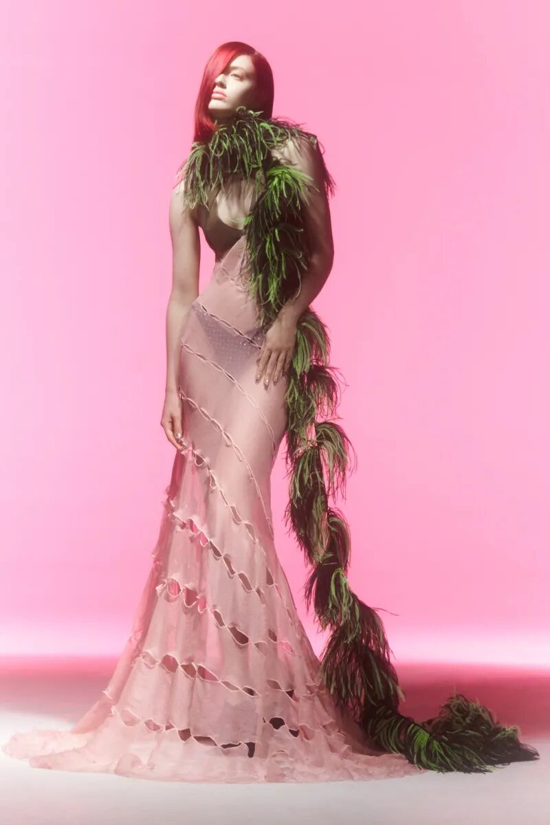 细节设计上,钩眼紧身衣、外露拉链和低垂宽腰带彰显90年代派对精神。硕大的耳坠模仿了品牌标志性的鸵鸟羽毛的弧度,将优雅和狂野描绘到了极致。