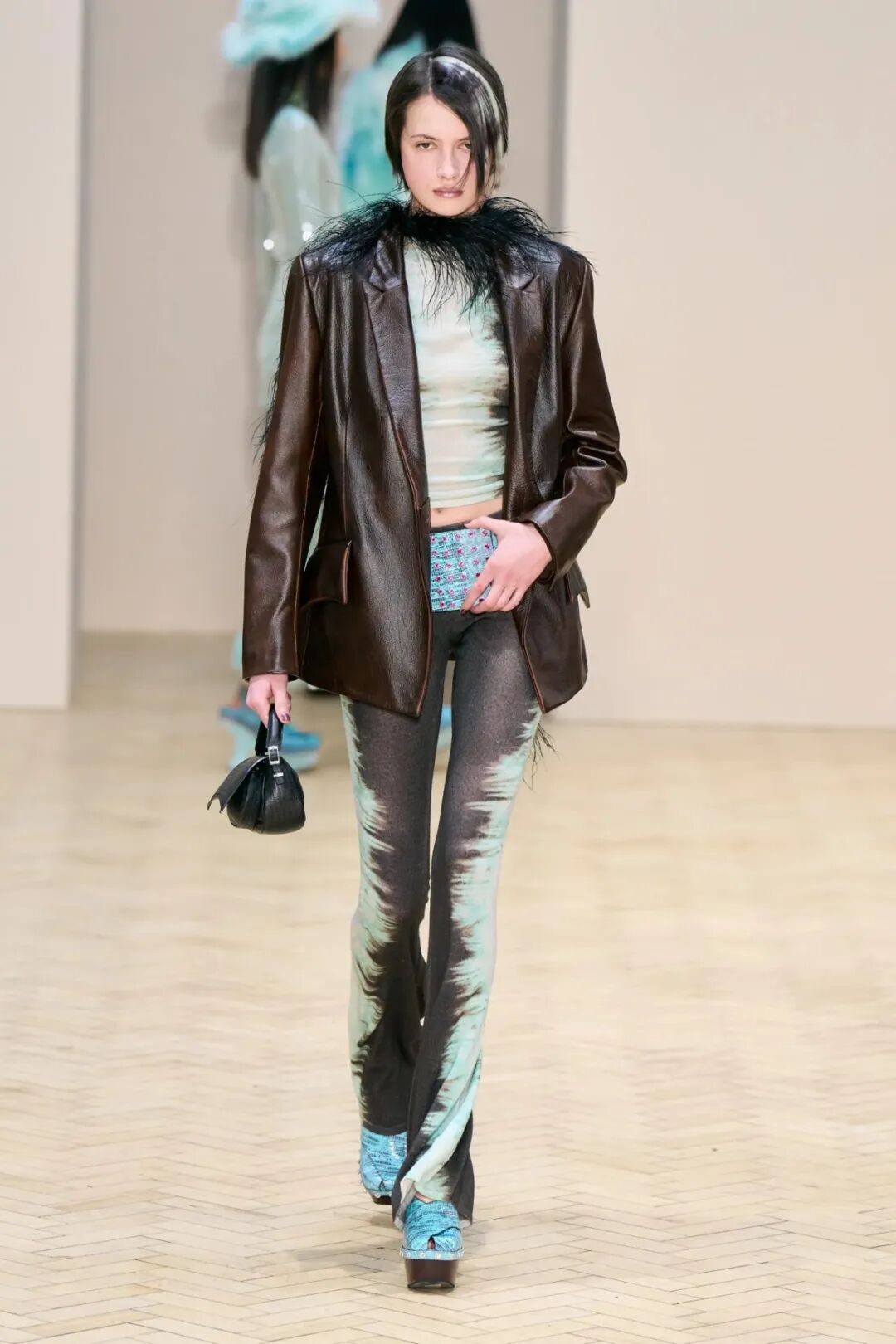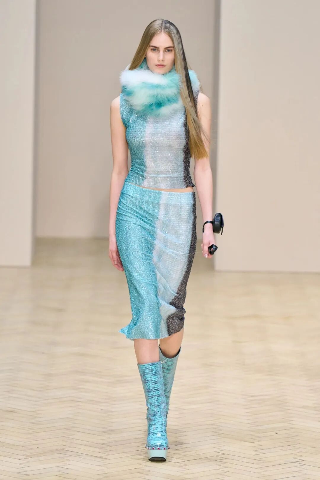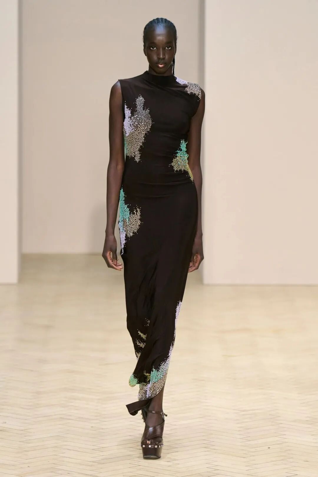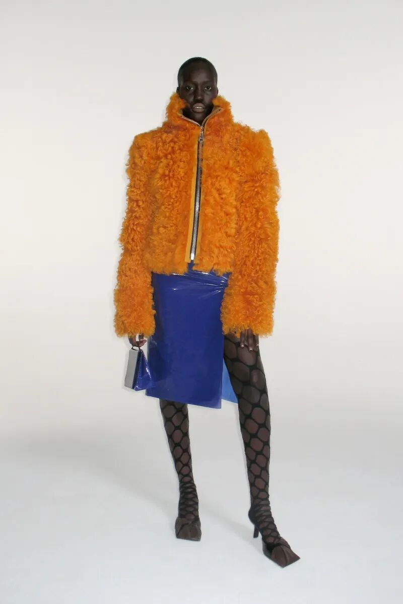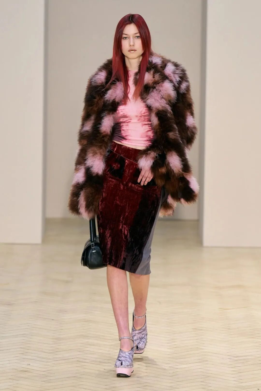 细节设计上,钩眼紧身衣、外露拉链和低垂宽腰带彰显90年代派对精神。硕大的耳坠模仿了品牌标志性的鸵鸟羽毛的弧度,将优雅和狂野描绘到了极致。