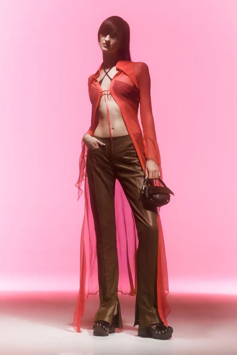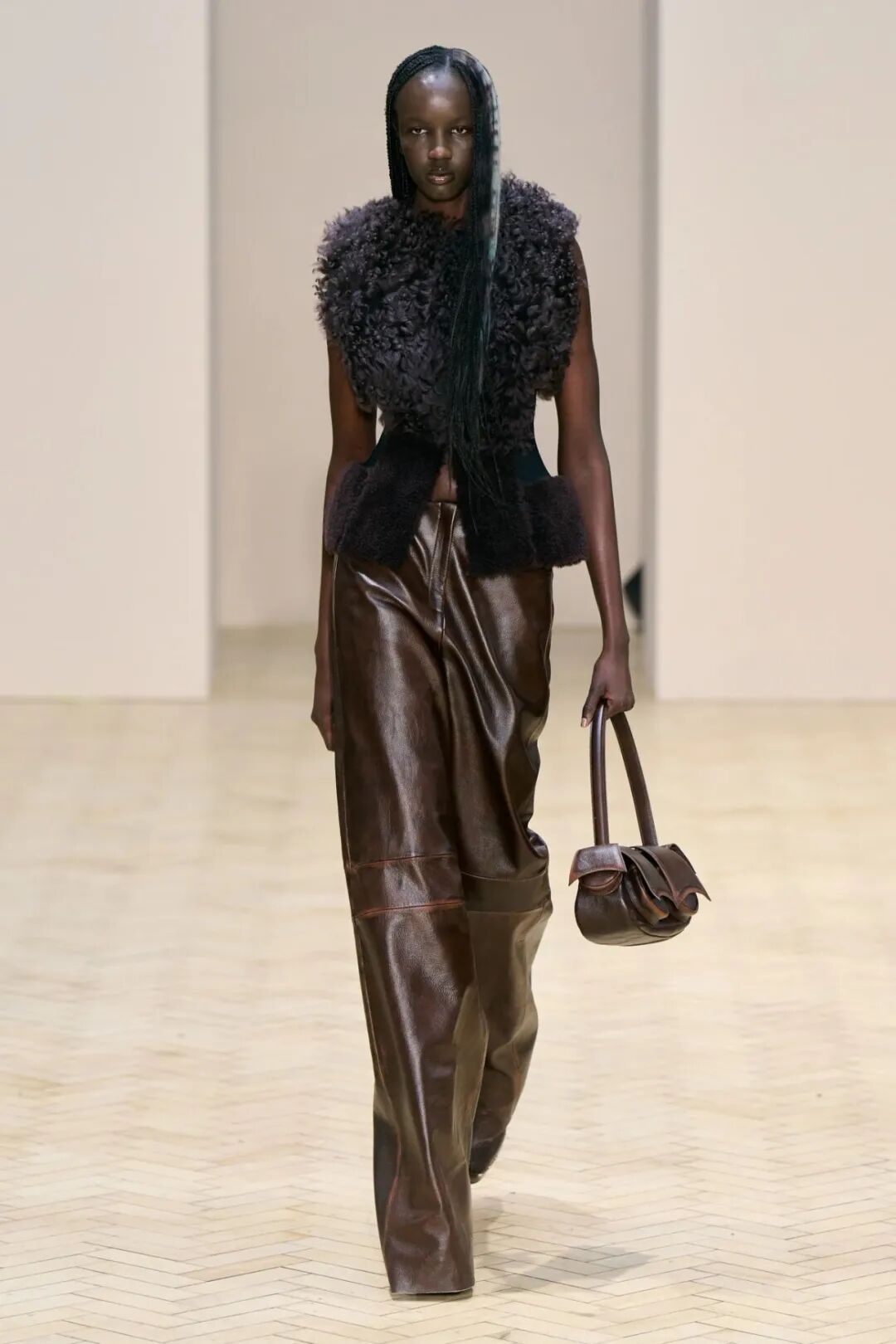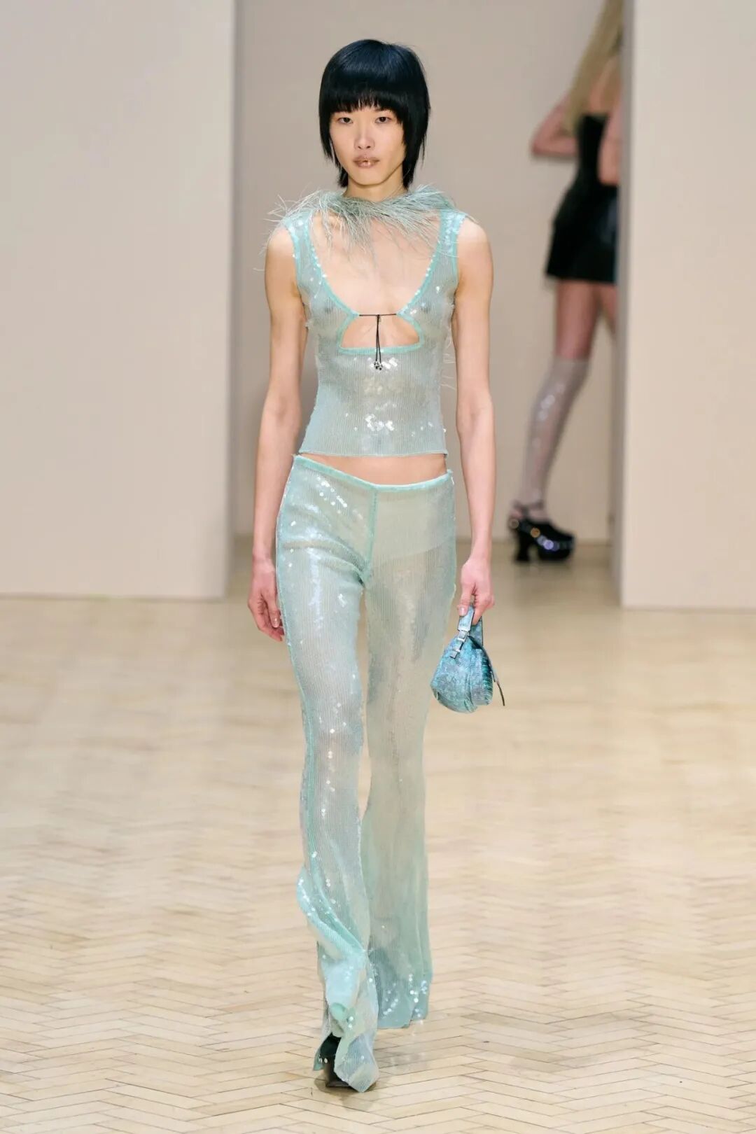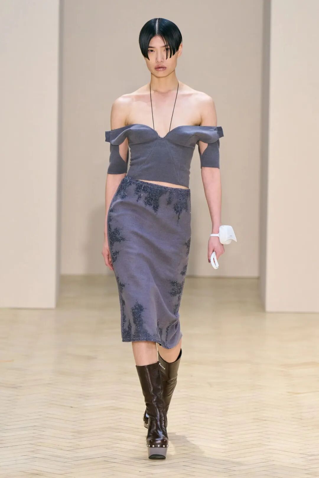 服装的镂空分割以及松紧转换为主,克制又性感的平衡了女性身体之美。合身的中长连衣裙配有内置皮革文胸,颈部吊带交错叠加。仅有系带固定的露肩衬衫,露出若隐若现的身体曲线。性感的上身设计搭配保守的超长喇叭裤,将克制的性感表达的淋漓尽致。