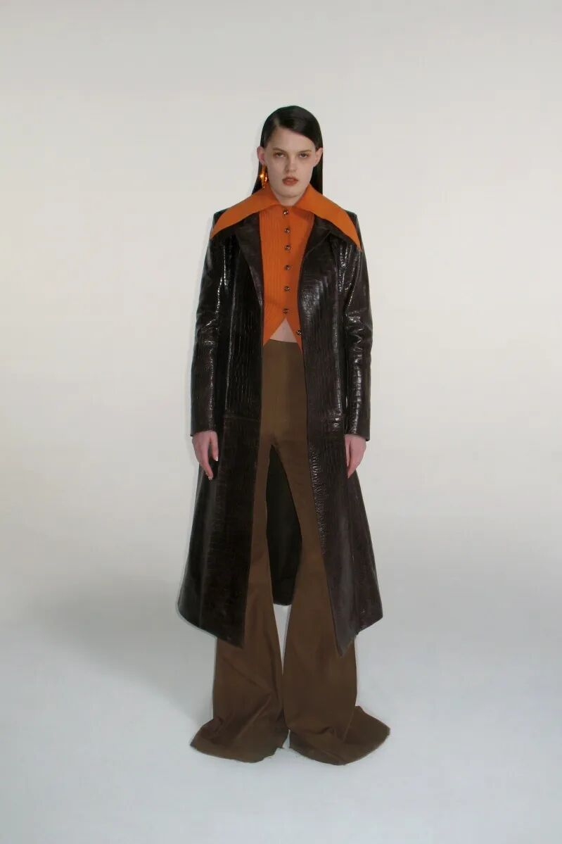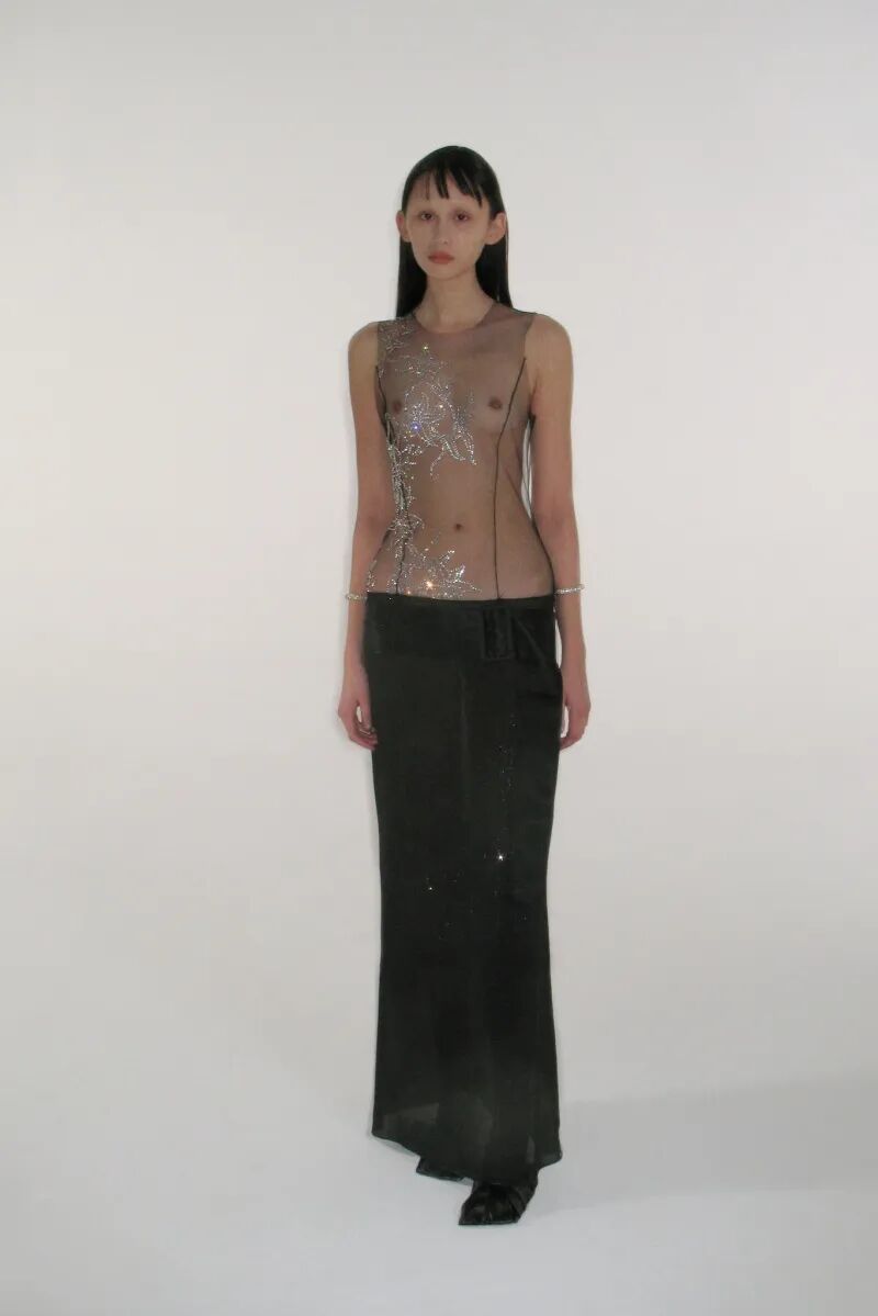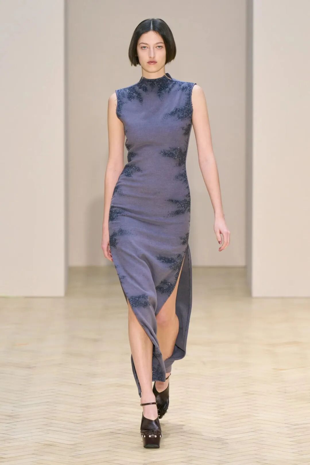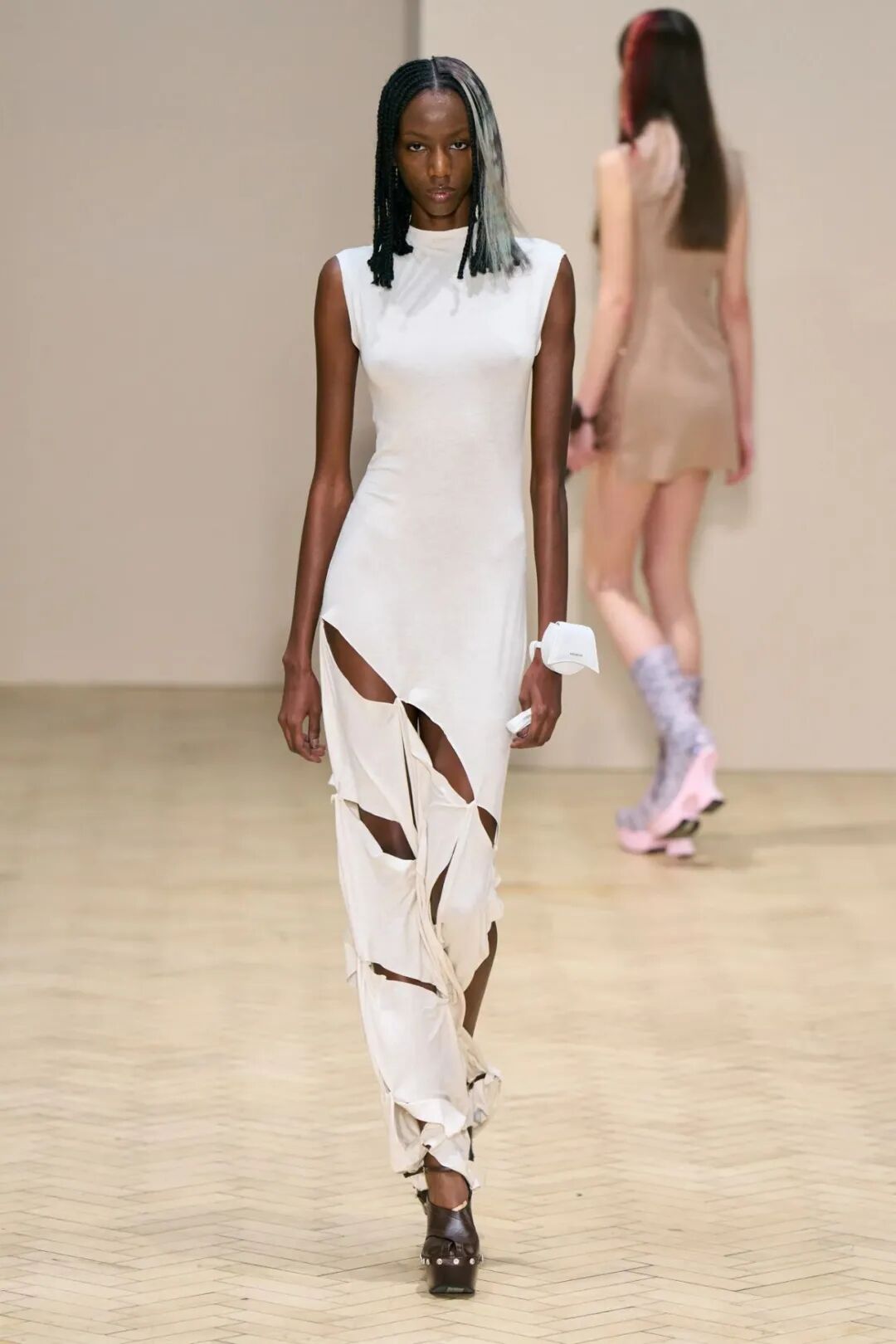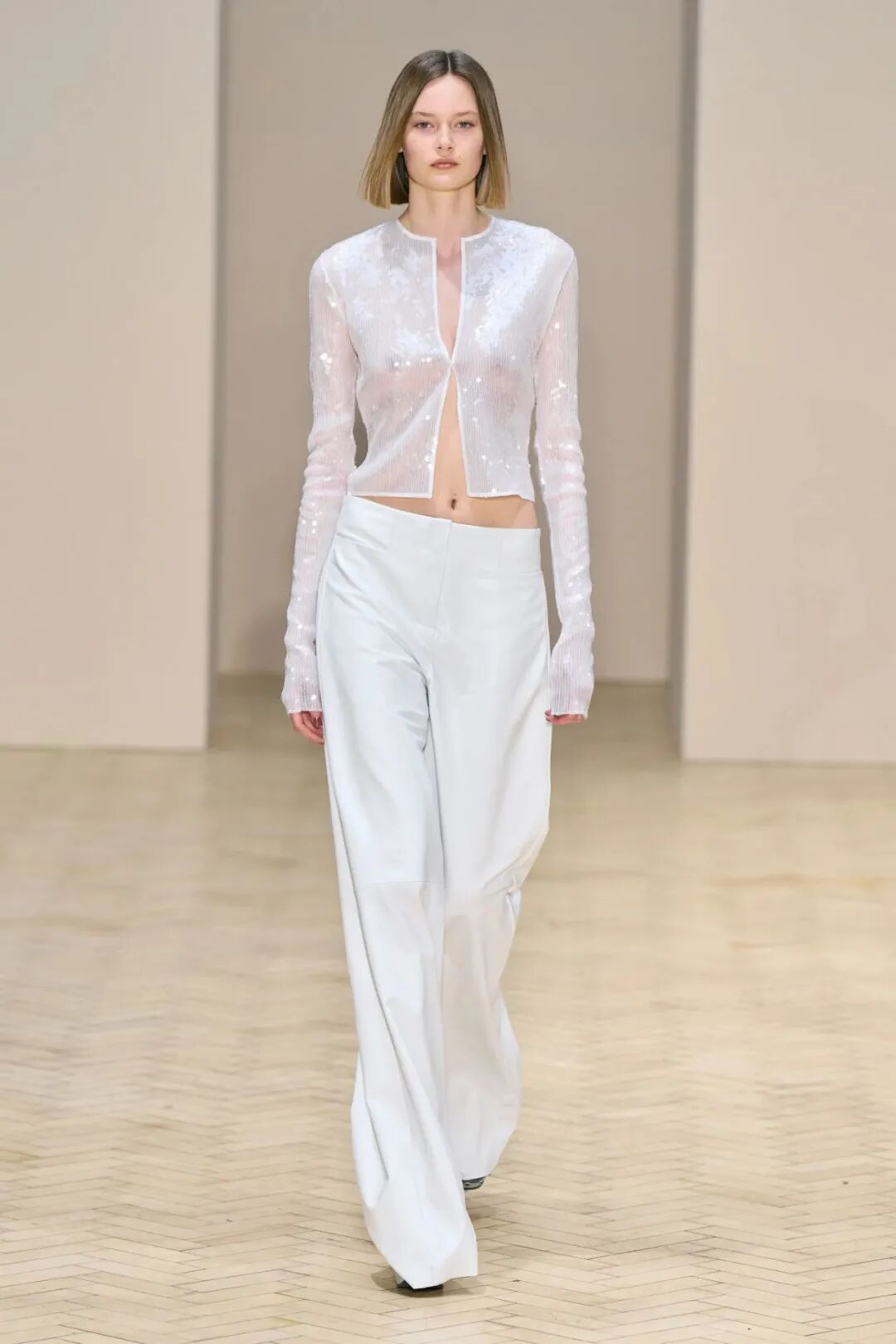 服装的镂空分割以及松紧转换为主,克制又性感的平衡了女性身体之美。合身的中长连衣裙配有内置皮革文胸,颈部吊带交错叠加。仅有系带固定的露肩衬衫,露出若隐若现的身体曲线。性感的上身设计搭配保守的超长喇叭裤,将克制的性感表达的淋漓尽致。
