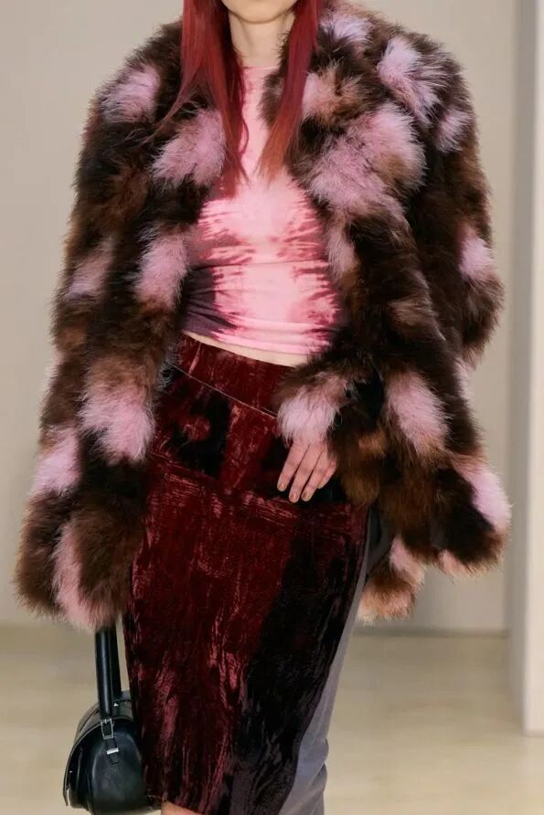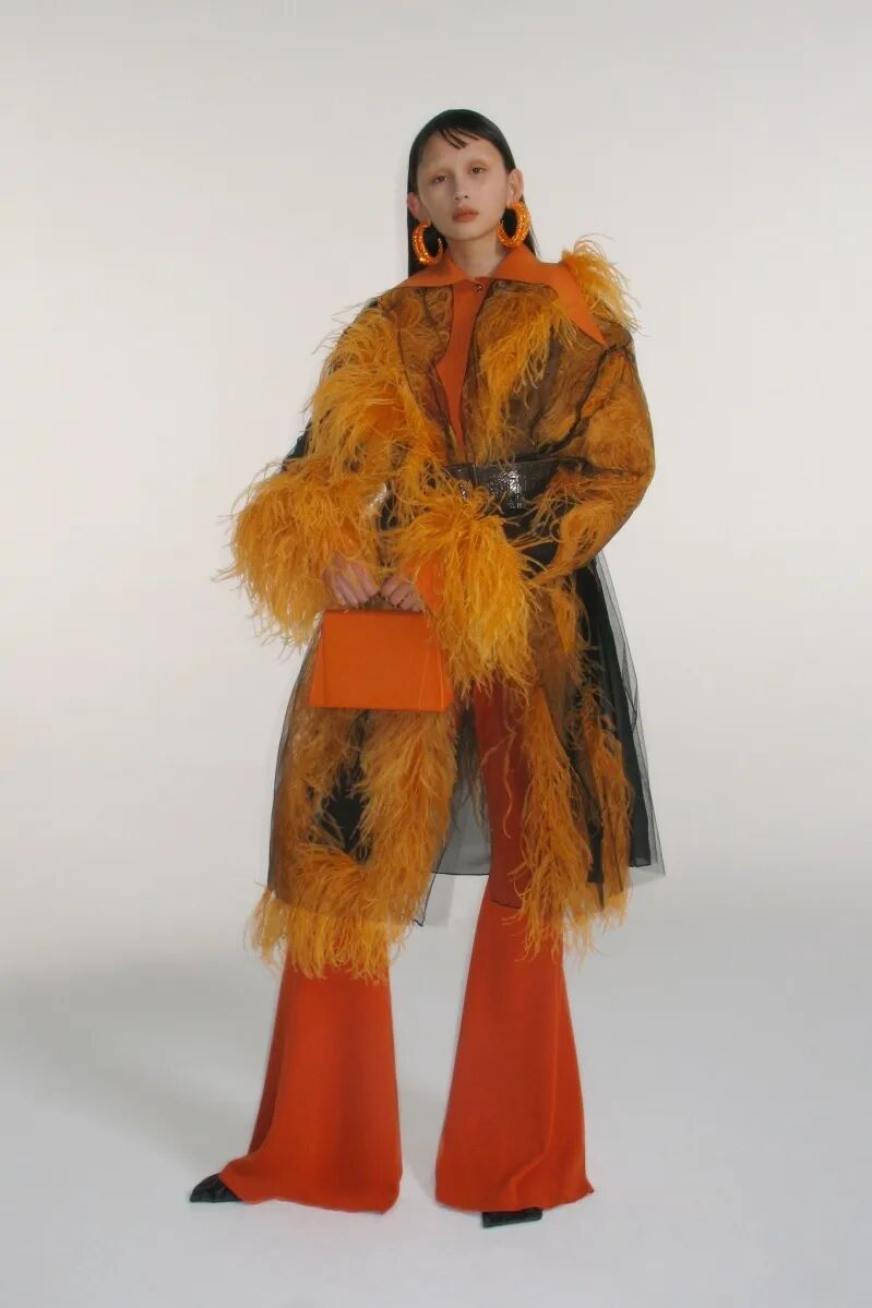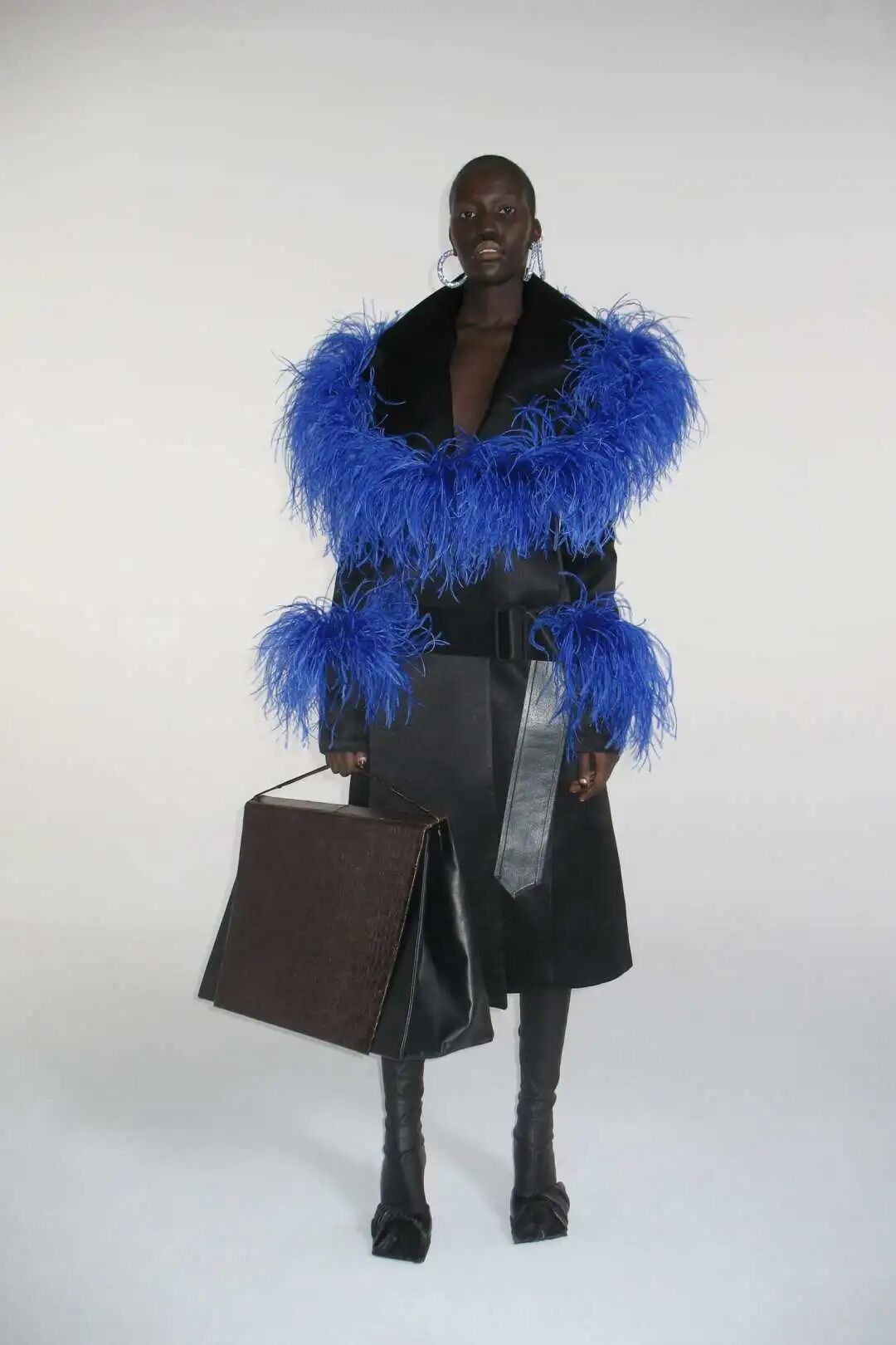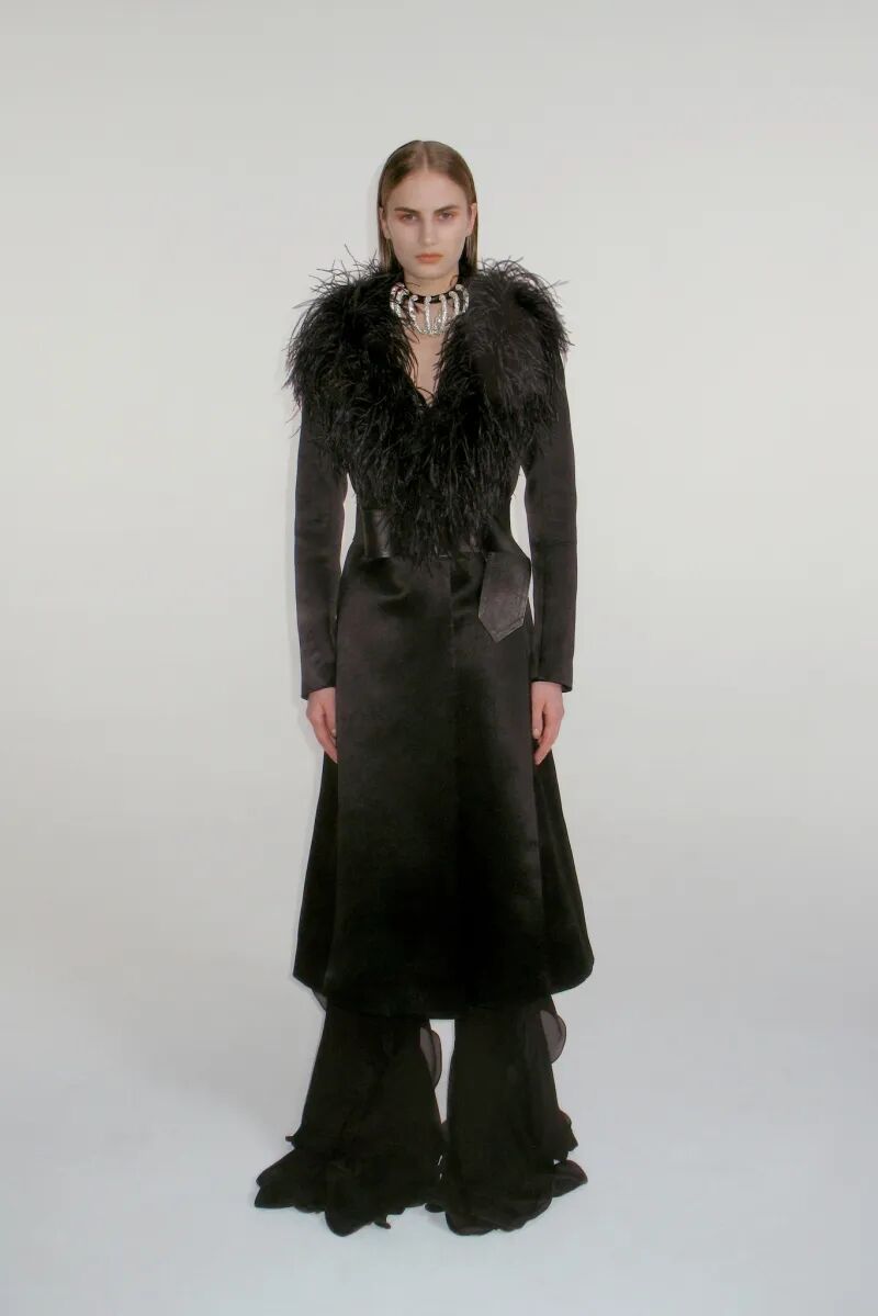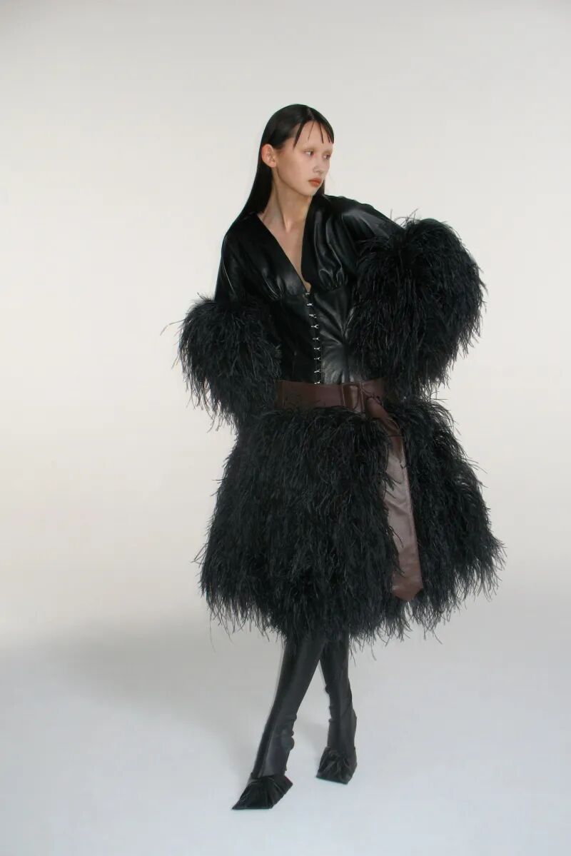 本季服装仍然沿用品牌标志性的鸵鸟羽毛、哑光缎布、皮革等材料。但与往季不同的是,除去经典的晚装,本季还推出一些日常经典的服装款式,带有夸张羽毛饰边的黑色大衣,超级闪亮且大号的羽绒夹克。