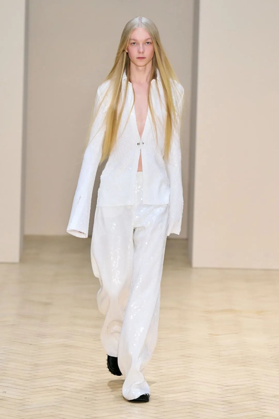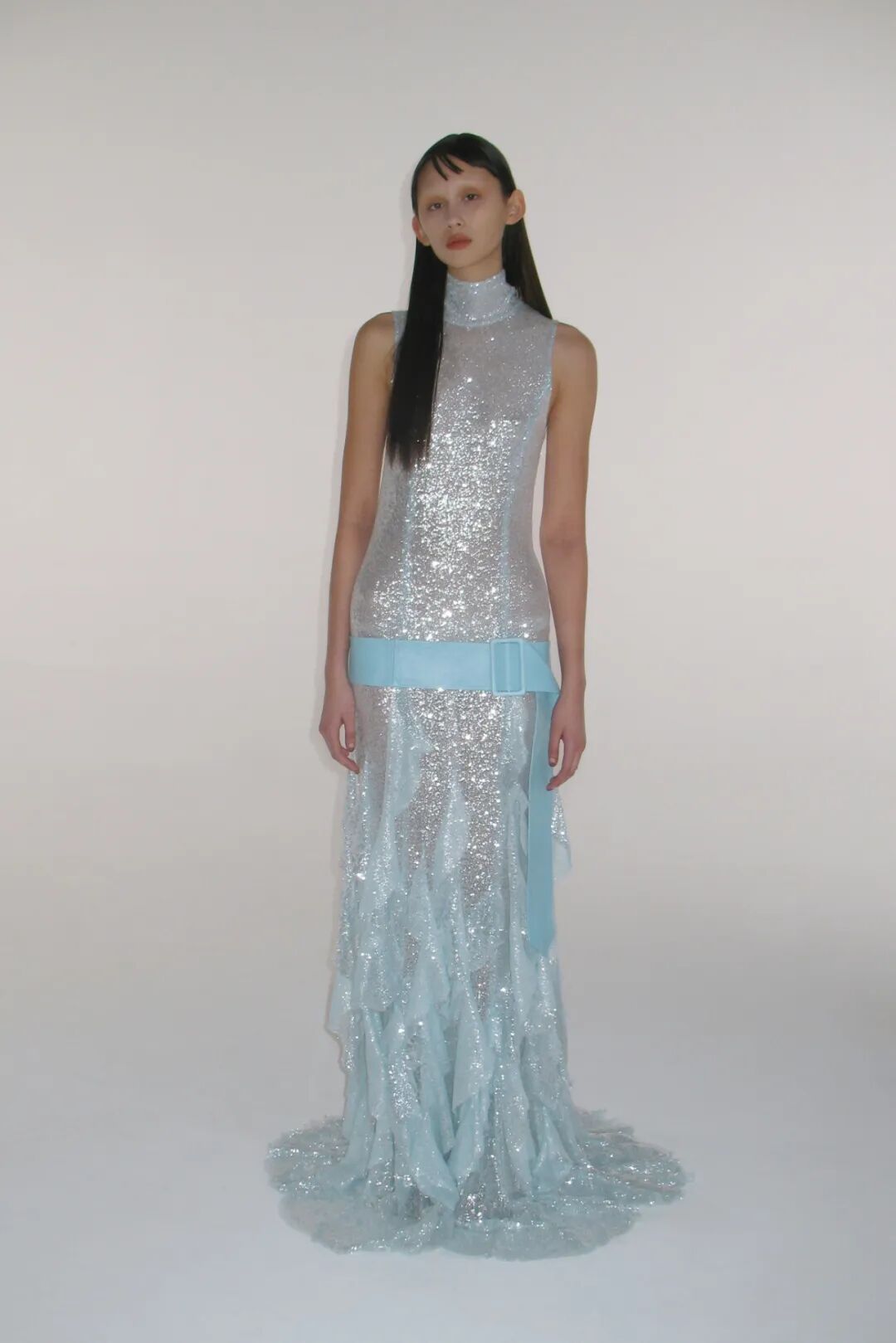 系列结尾的服装整体造型以白色制成,半透明的亮片使模特看起来像是从水中浮现出来的天使。