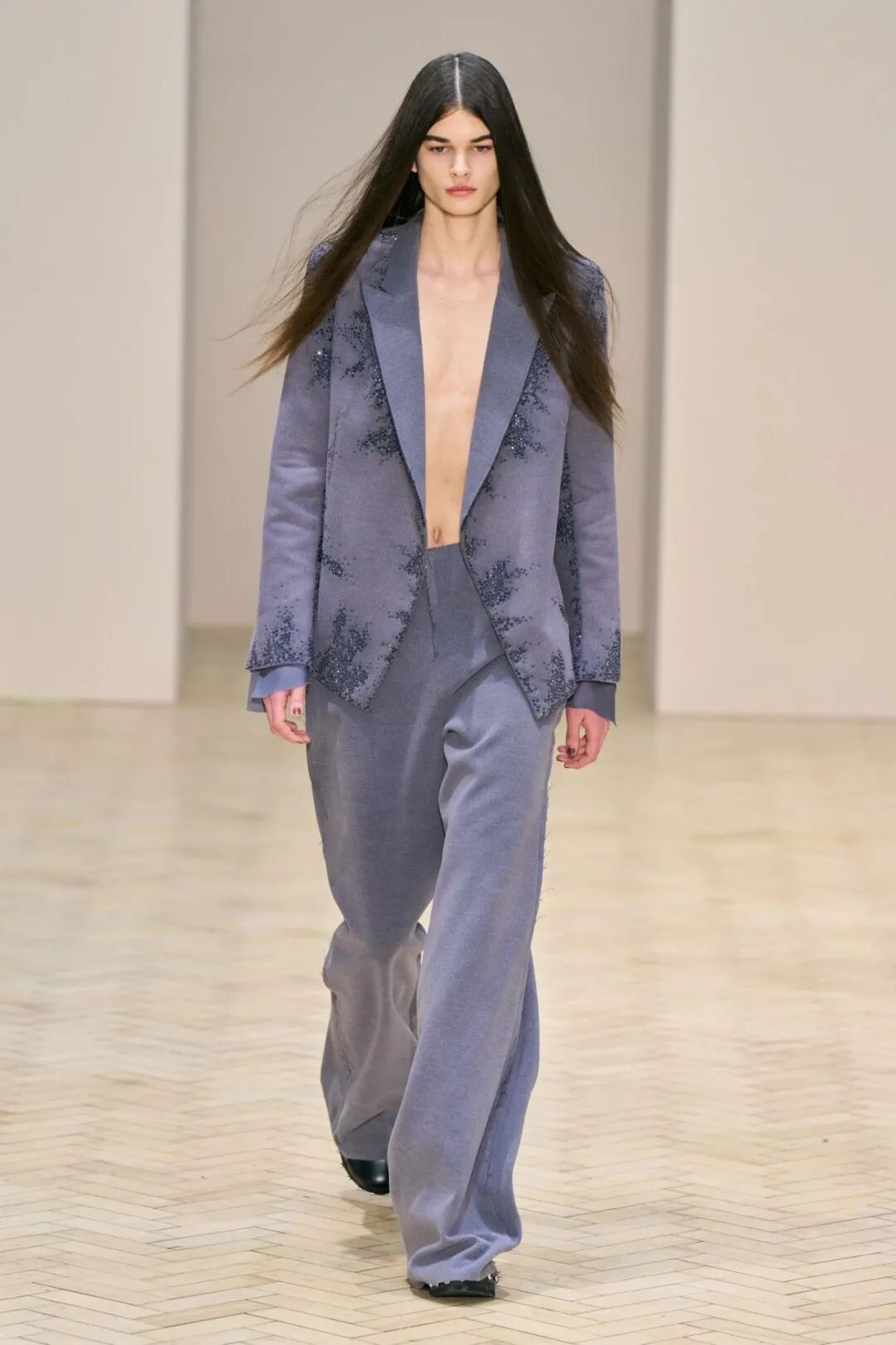 该系列灵感来源于Capaldo思念Cavenati的一个又一个夜晚。当他坐在缝纫台前哭泣时,泪水在面料上留下了痕迹,灵感便随之而来。Capaldo将泪水留下的痕迹变成了礼服上精美的装饰,用施华洛世奇水晶碎片浸透西装外套和礼服的边缘。