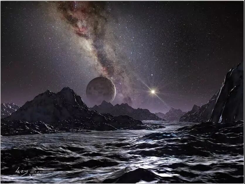一类是对太空景物的近距离观测。这类作品常常能突破遥远的太空疆界,将数亿光年的远方世界色彩斑斓地展现在我们的眼前,在浓重欲滴的幽深宇宙之下,各种星体灿烂明媚。由于喻京川采用了国际通用的喷绘笔,所以星体的每一个细节都分毫毕现。