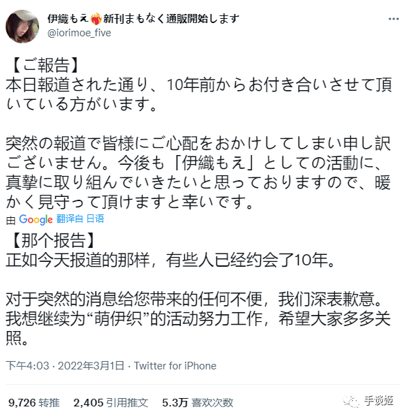在文章中,伊织萌坦率地承认了恋情,并且表示二人已经交往了有10年。