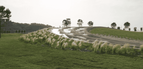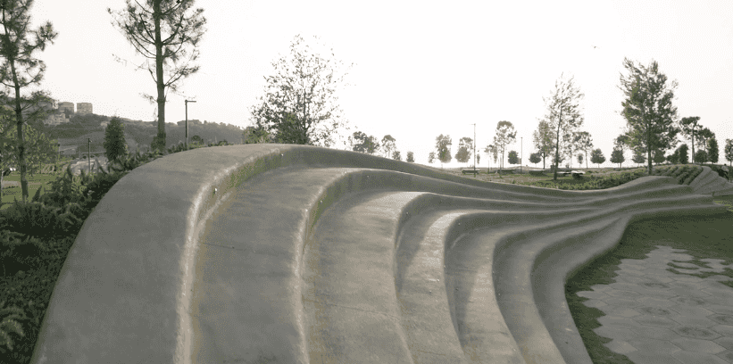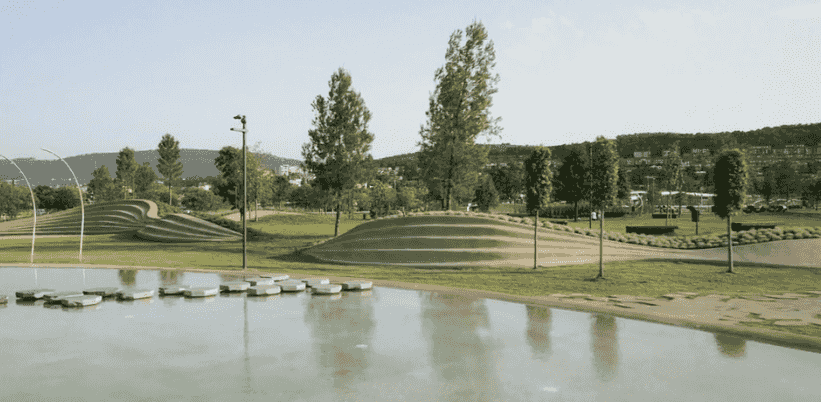 the basic building blocks of the new city park have been conceived as monolithic and undulating urban elements.