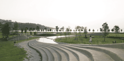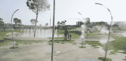 池塘、地面洒水装置、间歇泉、抛物线型水柱、瀑布和水上平台鼓励人们积极利用空间,并将潜在的未来海滩扩展到公园的内部。