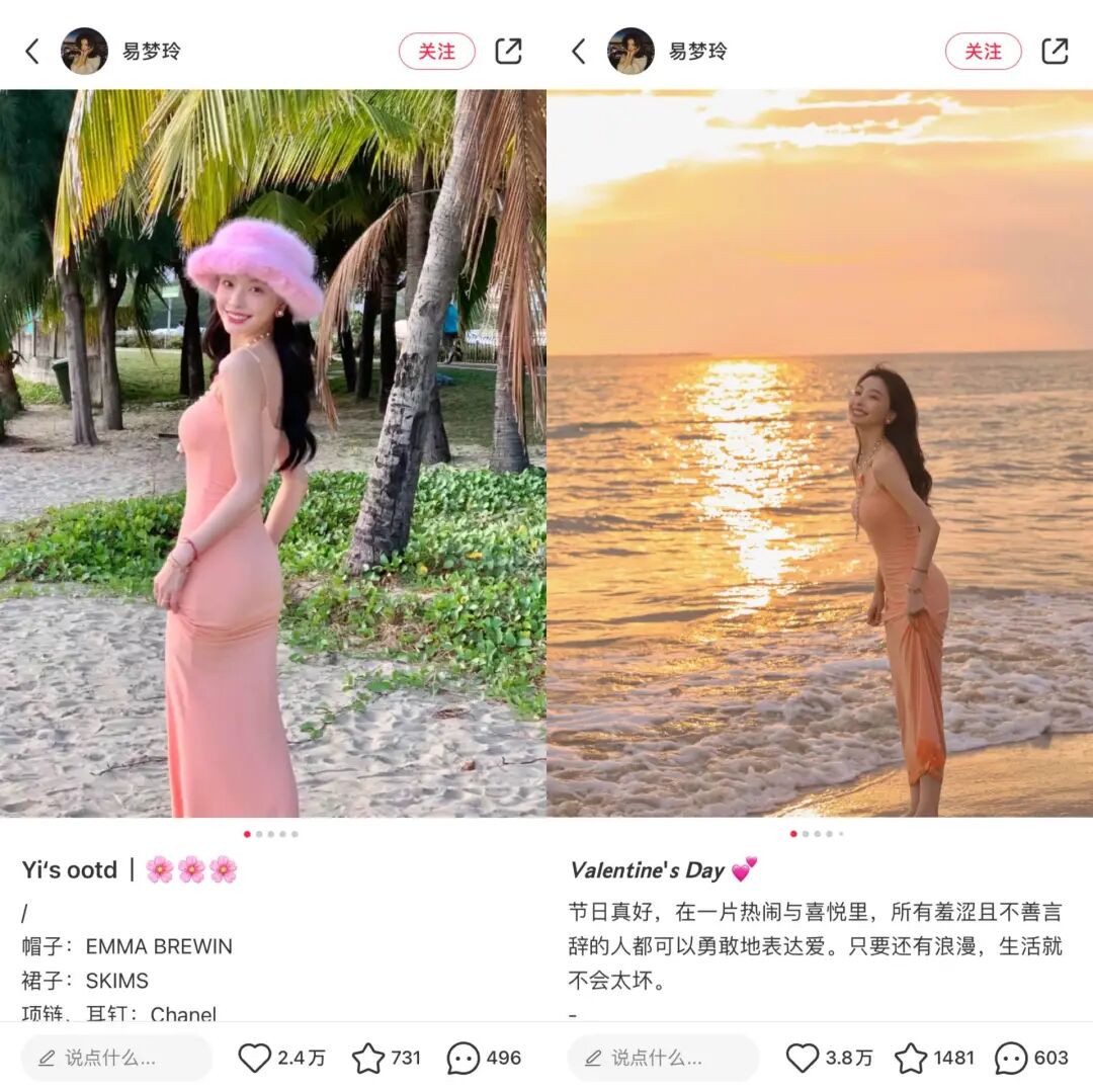 今年1月30日、2月13日,易梦玲身着一条Skims人鱼裙,发布了2条小红书: