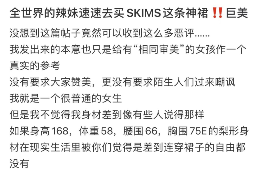 “能不能把Skims裙穿好看”,也替代“能不能轻松驾驭BM风”,成了当下女生中最新暗戳戳比美标准。