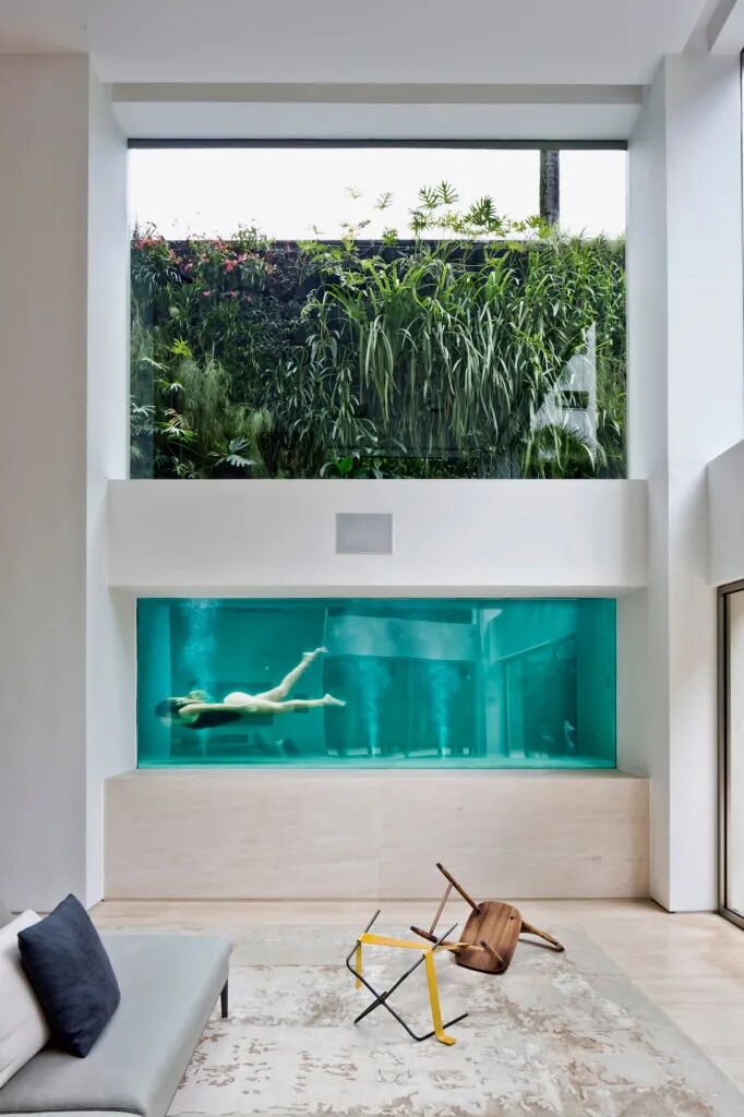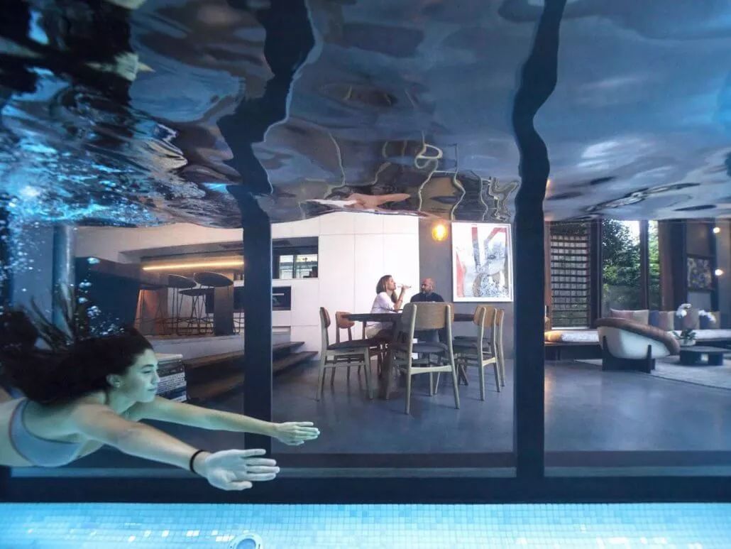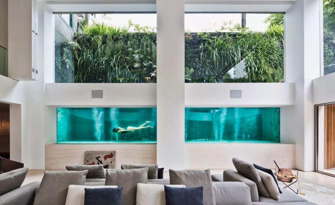 从室内可以看到泳池内的场景,整个房间也犹如一个大玻璃缸,光线穿过水面在照进室内,很有沉浸式体验感。