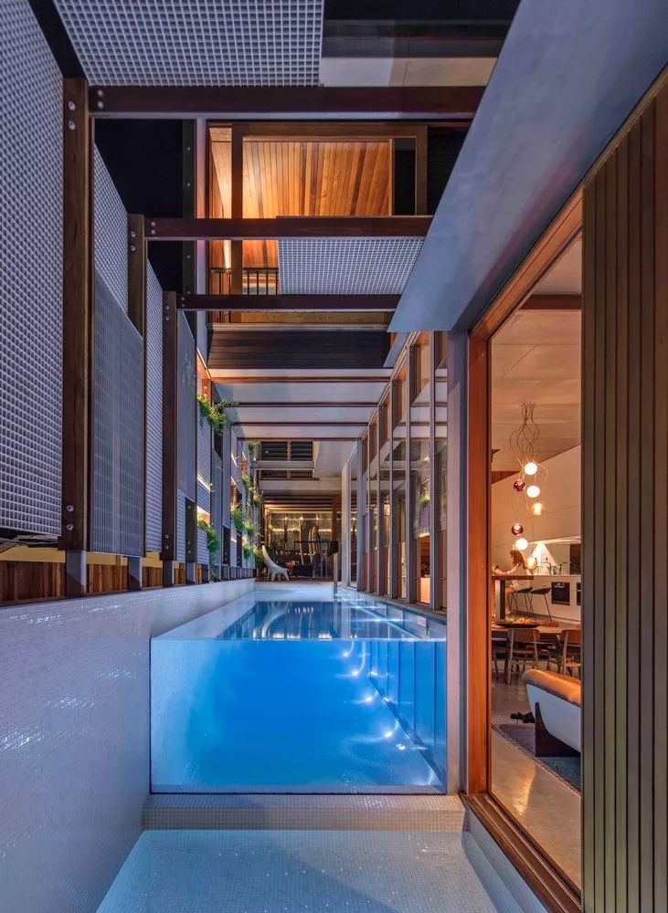 泳池周围用木材和钢将整个区域环绕起来,保证安全,也防止游泳时出现水花四溅的情景,水面折射出来的光更是为室内增加了一丝梦幻感。