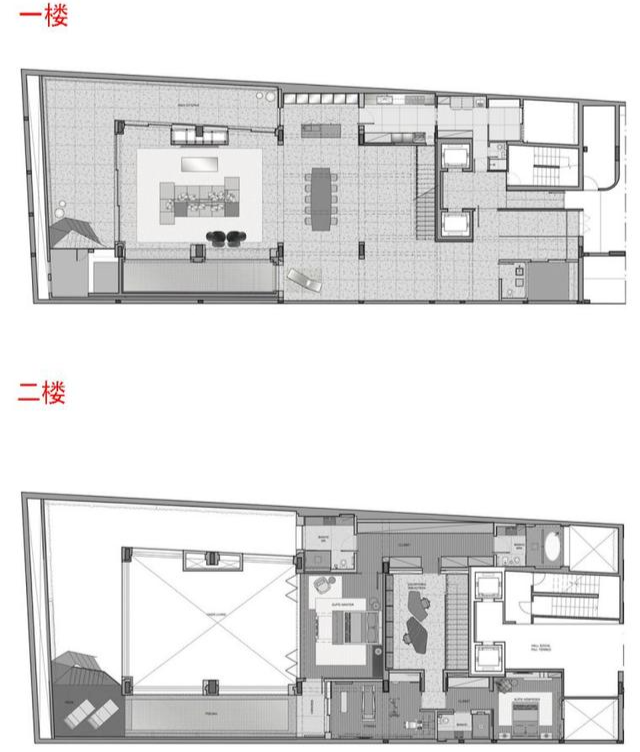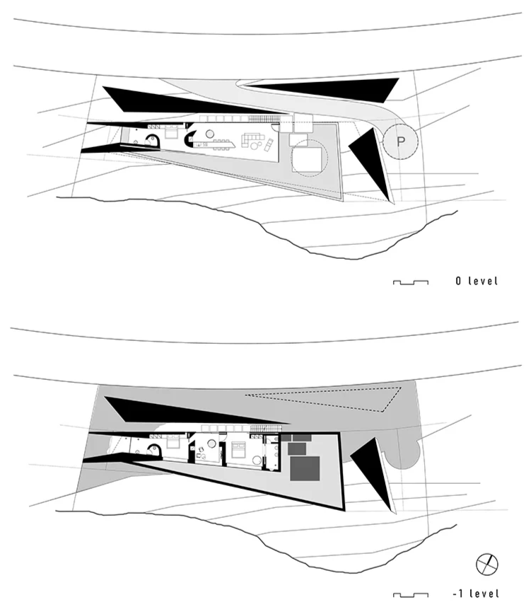 别墅一楼是起居室下层是卧室,卧室内的一面墙与泳池相连,借助自然光线和水可以构成一种特殊的视觉体验。