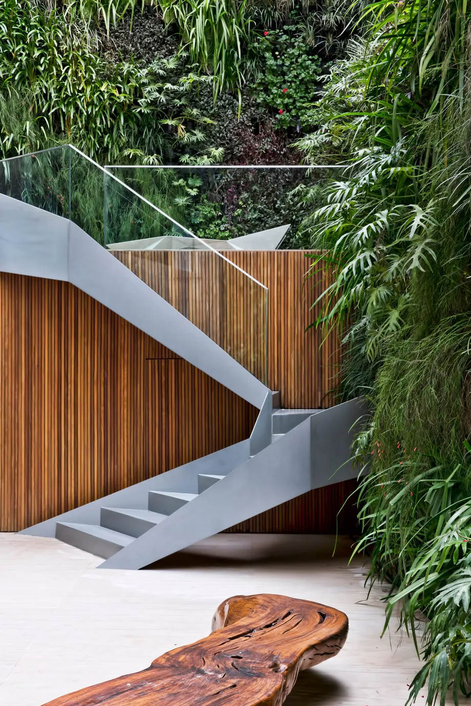 这栋别墅是由女设计师  Fernanda Marques 打造,房子面积为 477㎡,最棒的部分是 6 米高的客厅设计,整个客厅背景墙面除了承重柱之外全部采用玻璃打造,能清晰的看到院子的植物墙和泳池。
