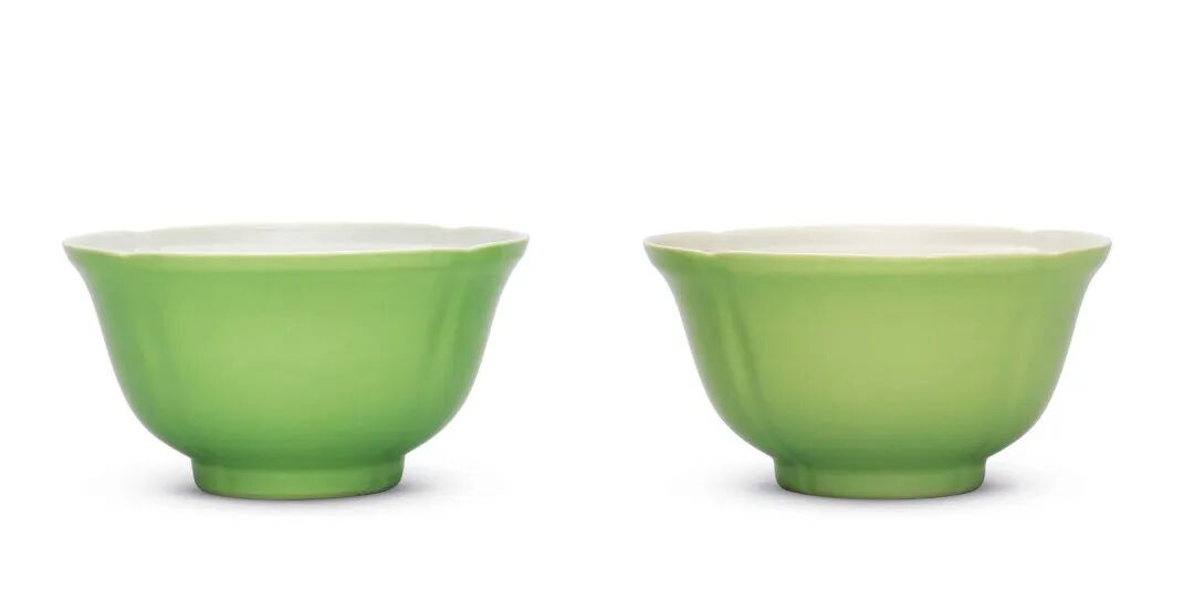 清雍正 秋葵绿釉花瓣式碗一对