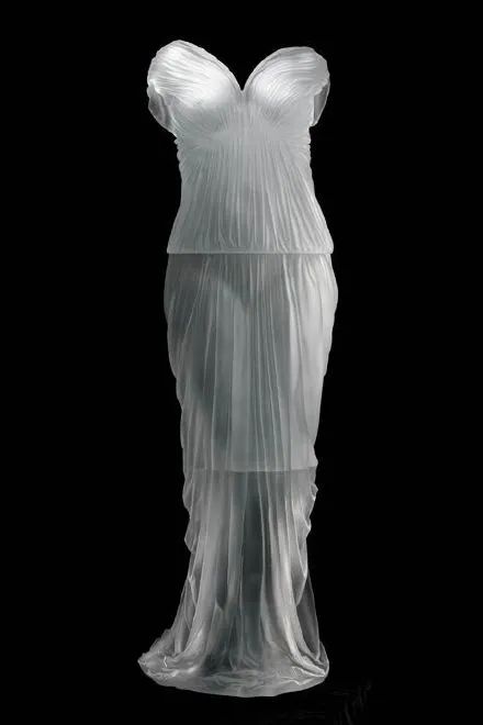 说起在服装制作材料上的创意,不得不提到Chalayan,他曾在2001年的春夏系列,他使用糖浆和甘油加热形成的糖化玻璃作为服装材质,制成了裙子。