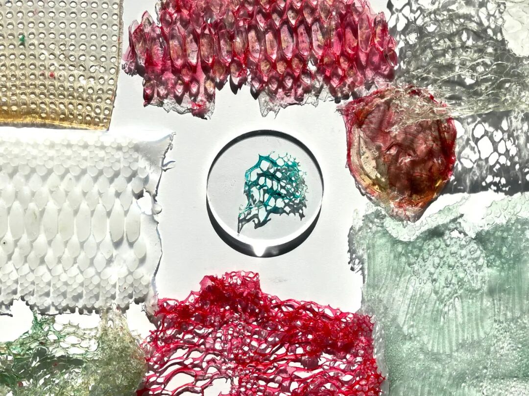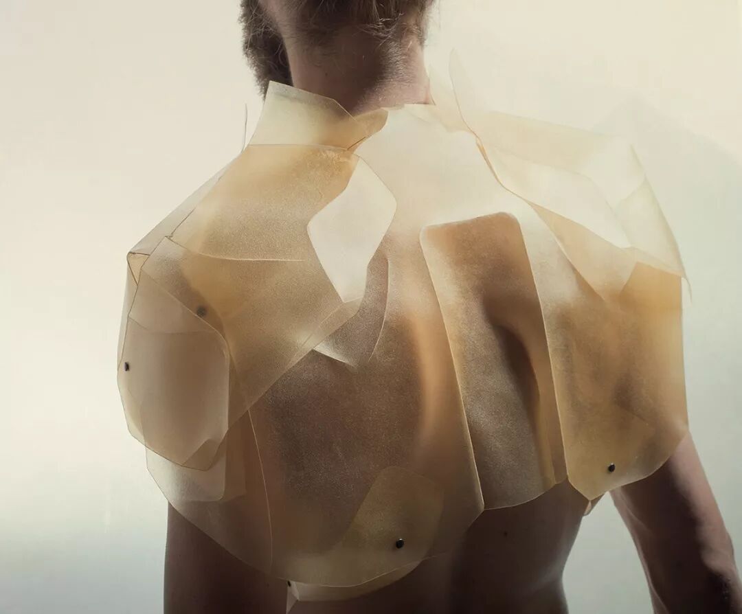 因为生物材料制成的原因,也会根据不同的湿度和温度而改变形状,用藻类设计的连衣裙可以在数小时内分解,身着 “玻璃” 裙的女孩可以不断游走在热闹的大街小巷和高楼之间,她身上的衣服也随之出现了不同形态的变化。