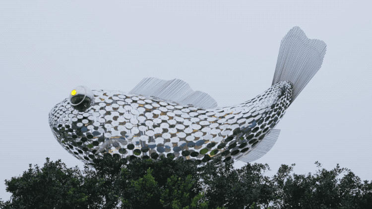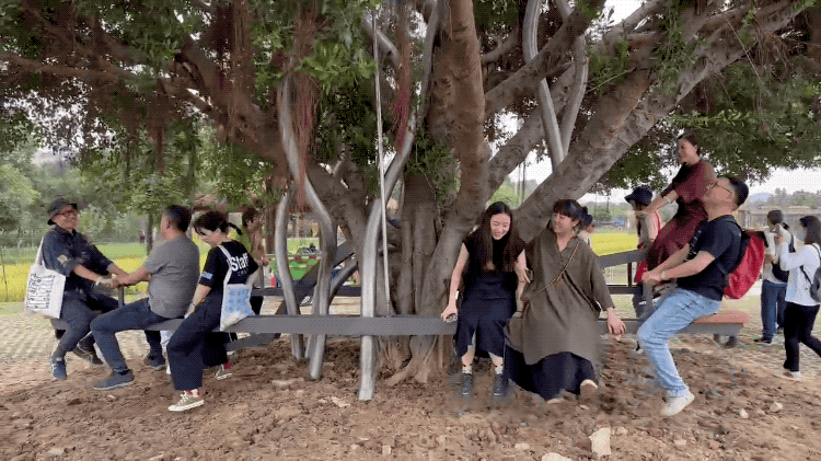 沈烈毅作品:《鱼跃鸢飞》 灵感来源于南海的农业模式桑基鱼塘,人在树下玩跷跷板,带动鱼身摆动。