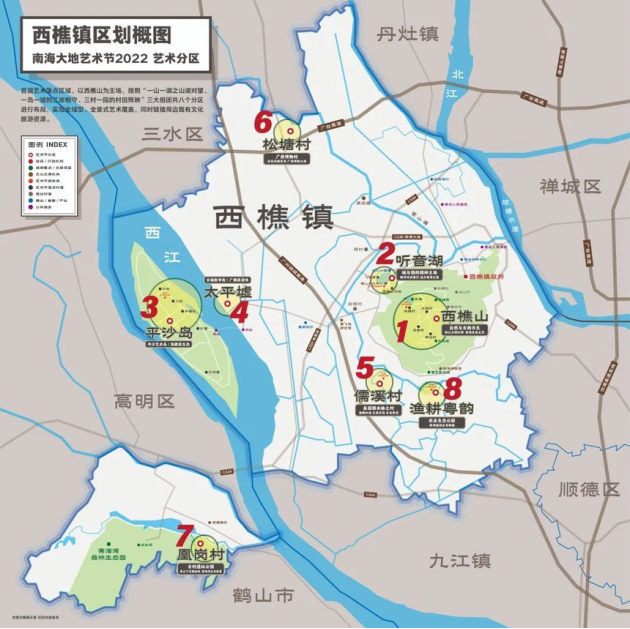 艺术节通过设立组委会,组建保障持续运营的执行架构,首届主会场在西樵镇全域176平方公里范围内展开,共设西樵山、听音湖、平沙岛、太平墟、松塘村、儒溪村、凰岗村、渔耕粤韵8个艺术分区,邀请了来自15个国家和地区的134组艺术家参与其中,徐冰、刘建华、马岩松、藤本壮介、浅井裕介、陈粉丸等艺术家们创作了73个艺术项目,点缀在南海西樵镇各处。计划用10年五届的时间,逐步向南海区全域拓展。