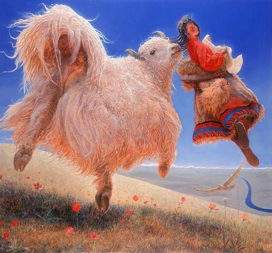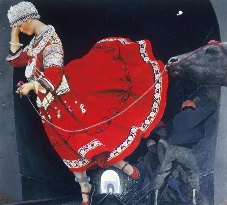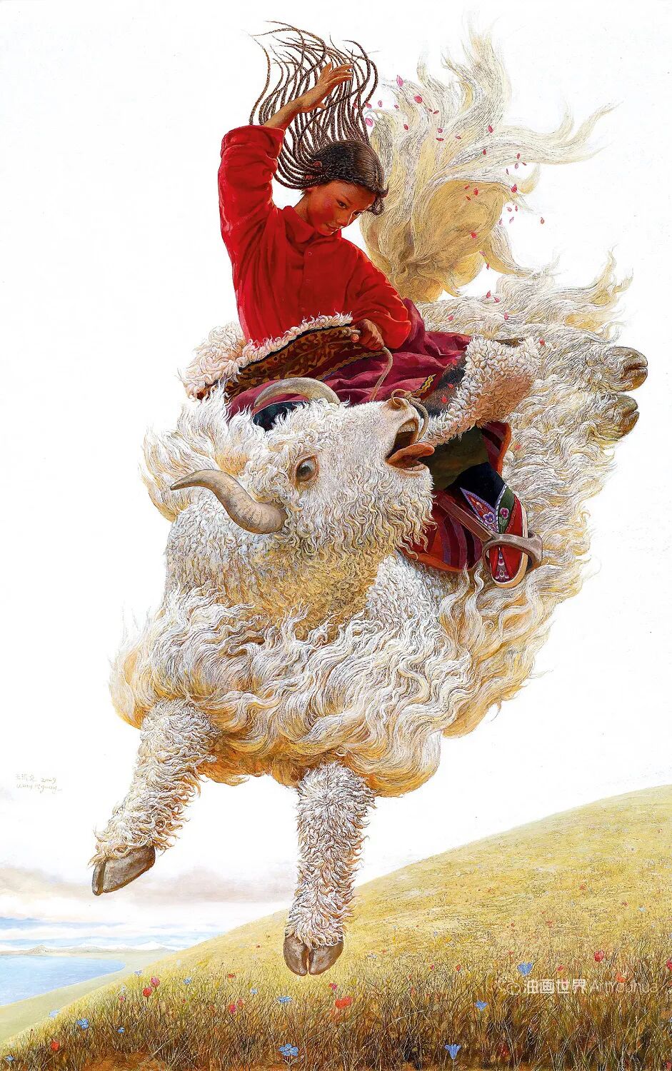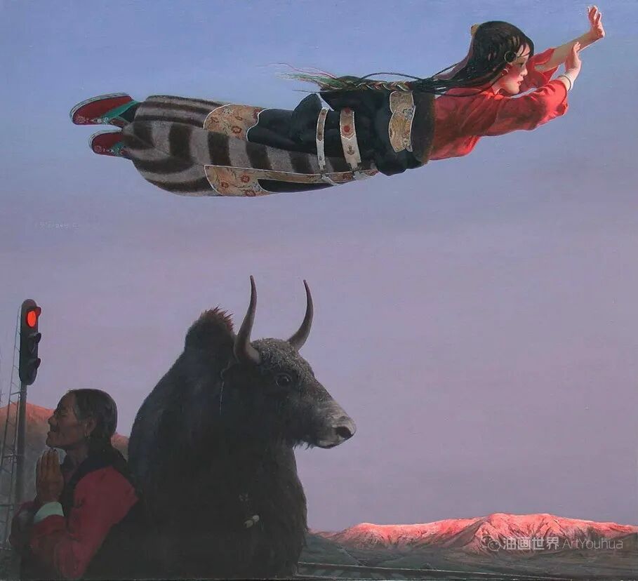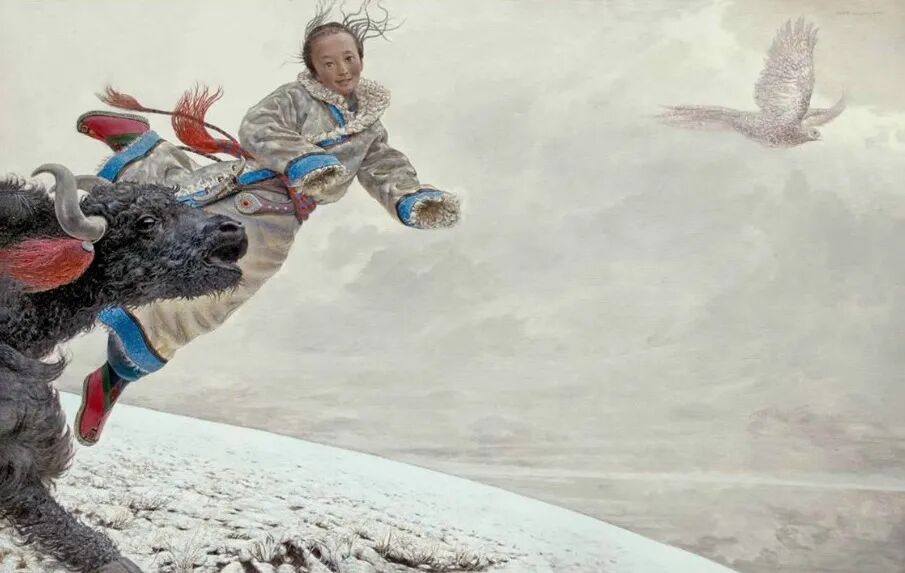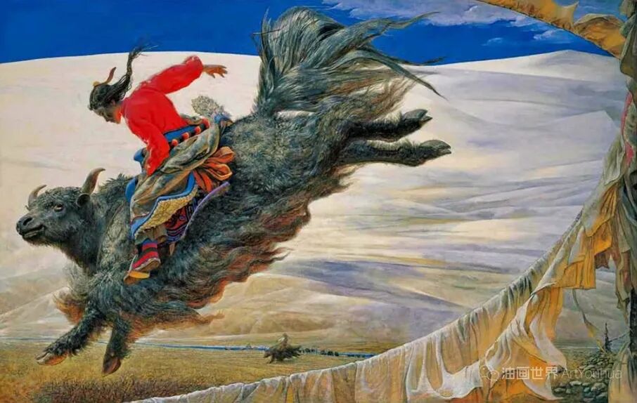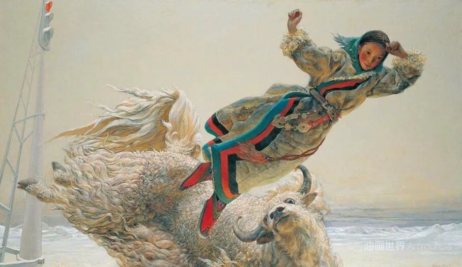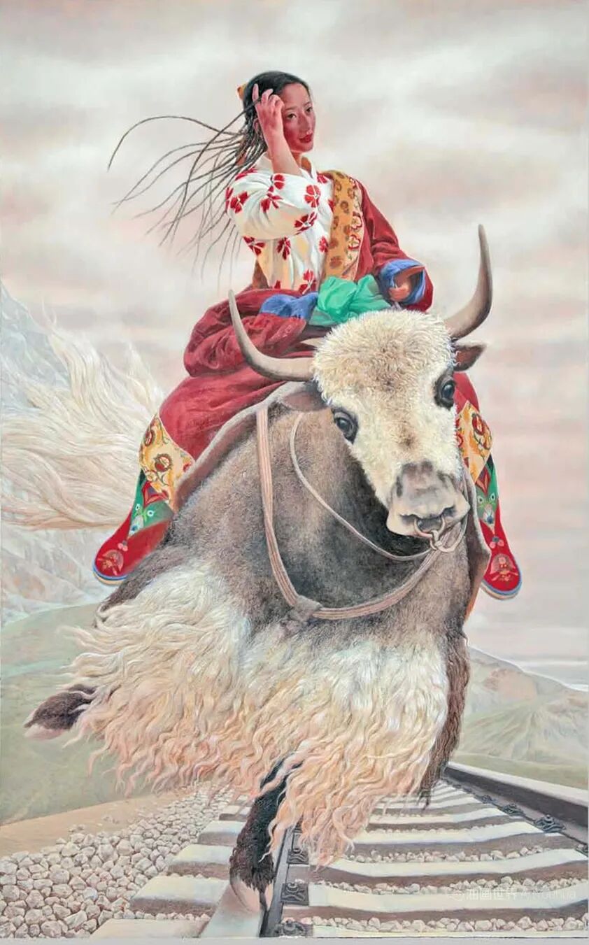 王沂光画笔下的藏族少女和牦牛,都不是简单的现实写照,而是把精神、灵感物化了的,是蓄积的势,是外放的张力,或者是只可意会的气韵。他让这些“势”和“韵”渐渐变成人物、动物,渐渐在眼前清晰,最后幻化成和谐的构图。别人绘画是从物象中折射出神采来,而他笔下的物象就是神采的物化。当然,这些物象都不是凭空而来的,是建立在一笔不苟、炉火纯青的造型基础上的。