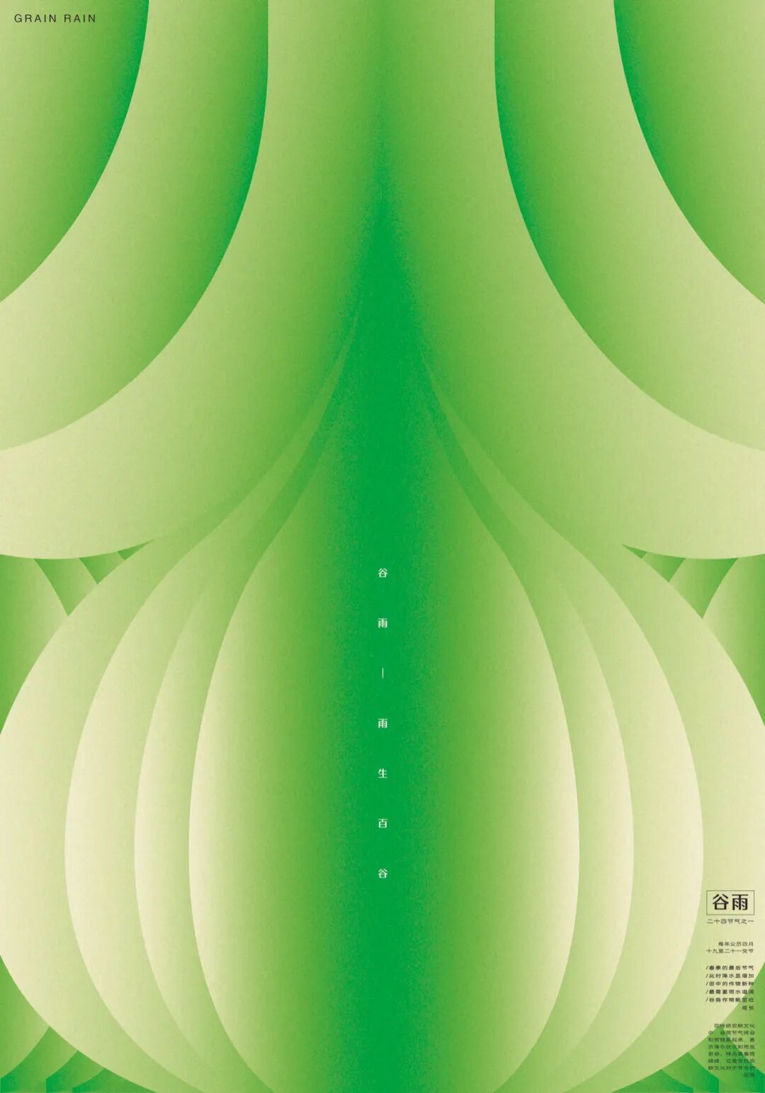 谷雨-有“雨生百谷”之意,营造作物新种、雨水滋润、百谷茁壮生长之境。