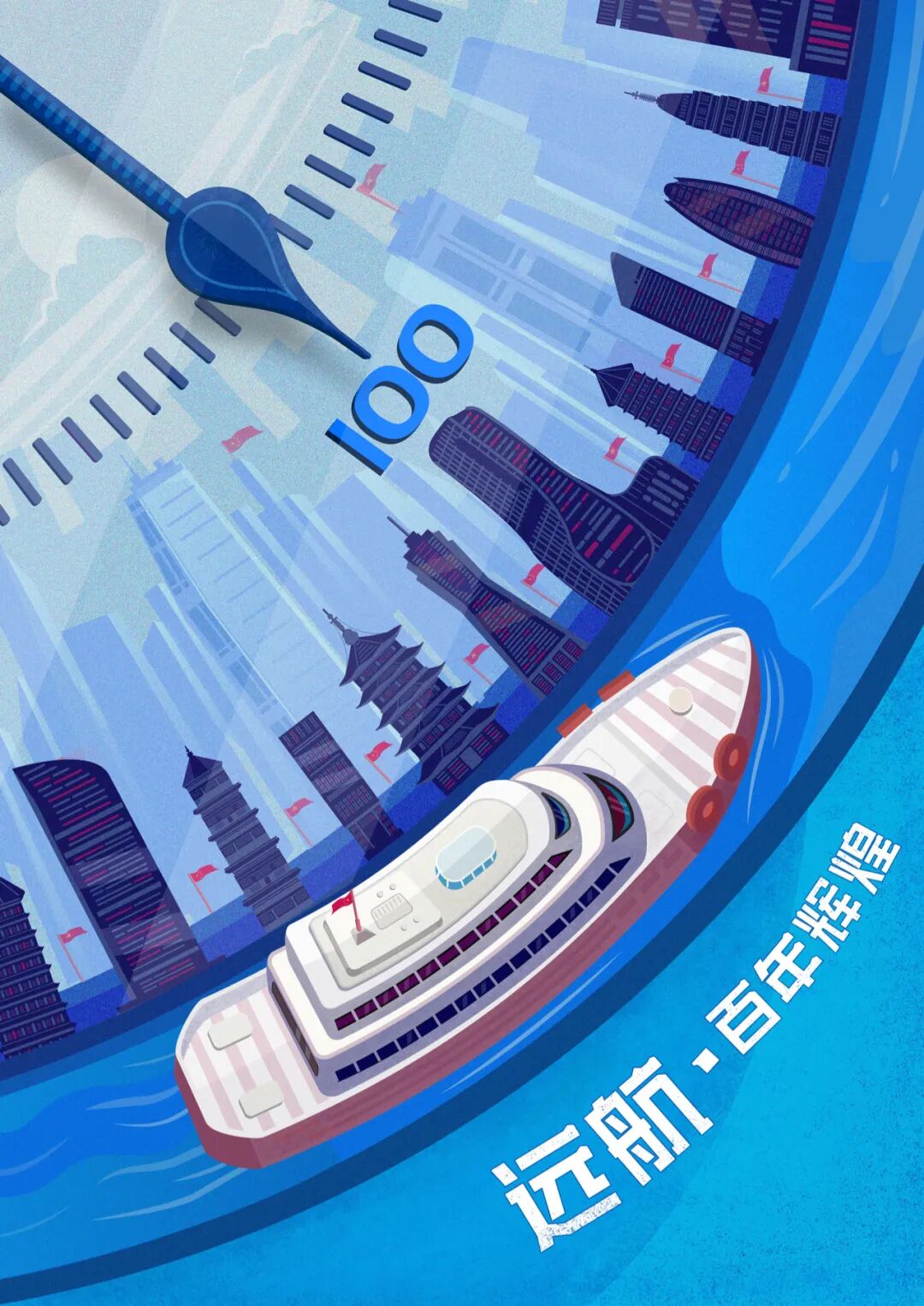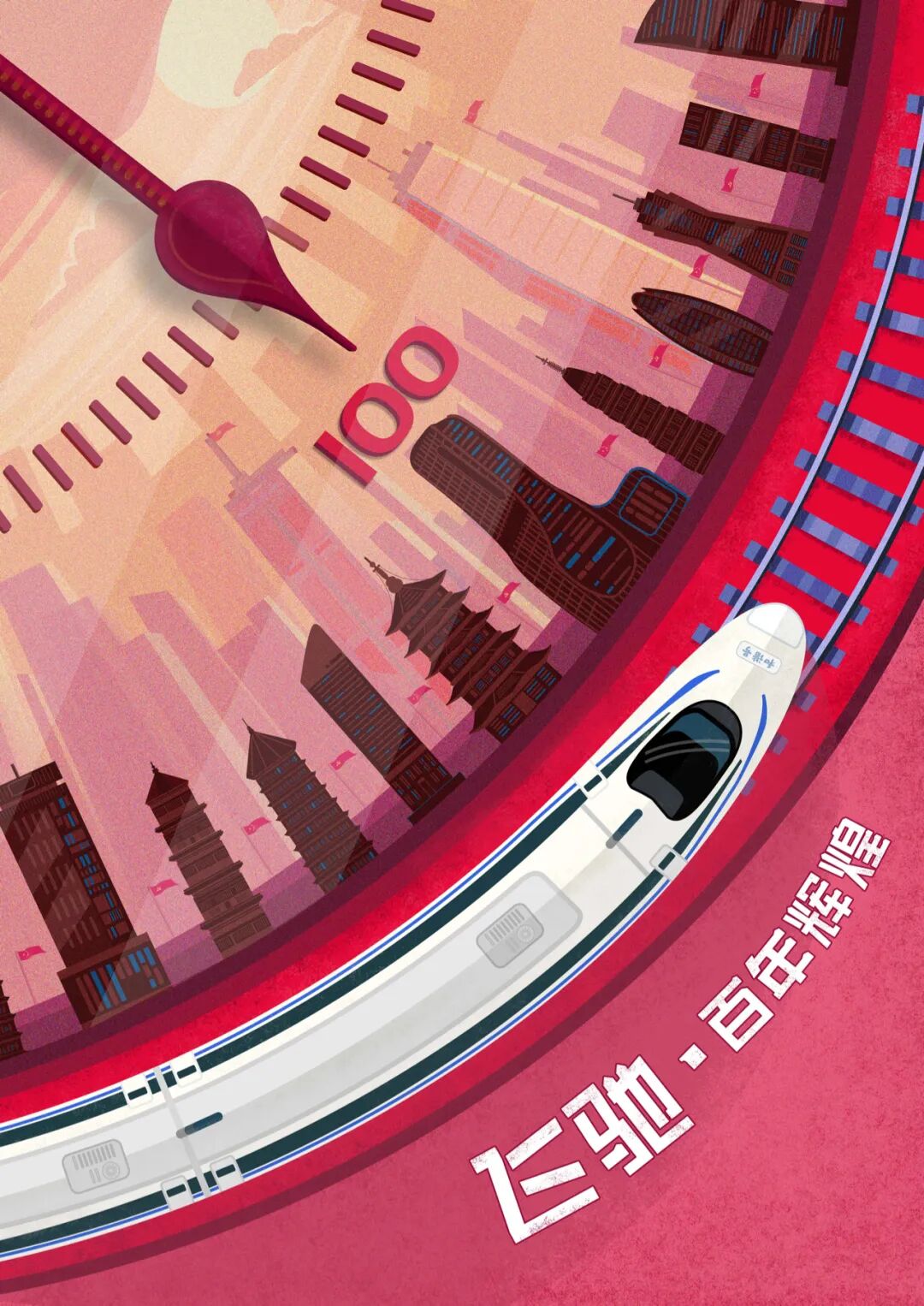 创意来源于钟表,将全国各地的一些特色建筑作为钟表的刻度,海陆空三种交通工具代表我国的发展力量,这种交通工具行驶到“100”的刻度时,指针也刚好指向“100”,来表达建党100周年的辉煌时刻!