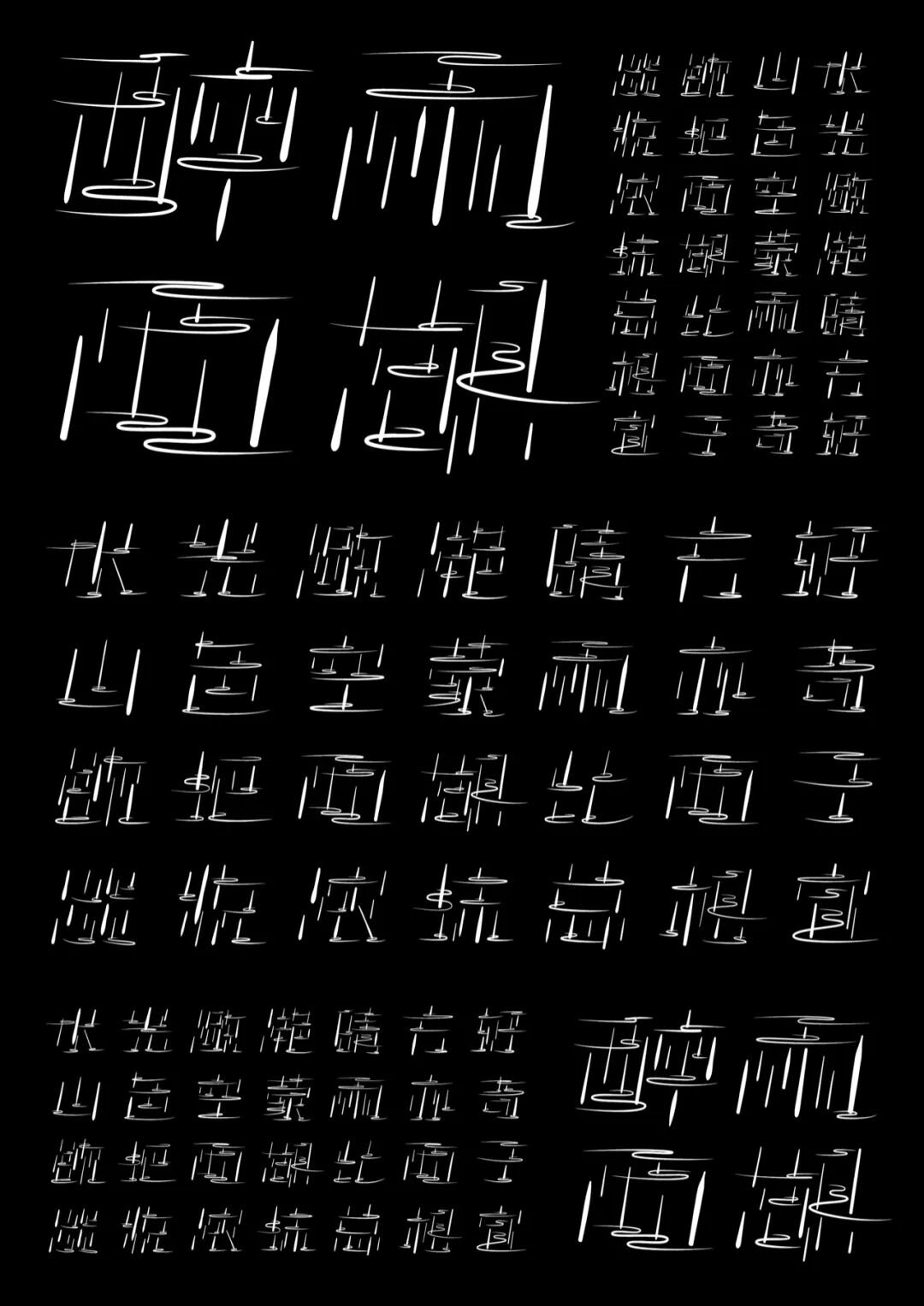 将雨滴与波纹作为汉字的各笔画,使雨滴与汉字结合,形成大雨的意境,体现汉字文化的趣味性,探索汉字的无限可能。