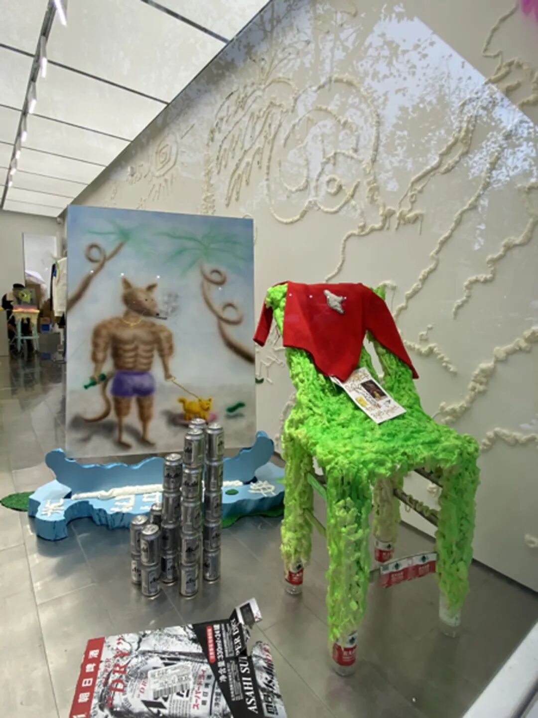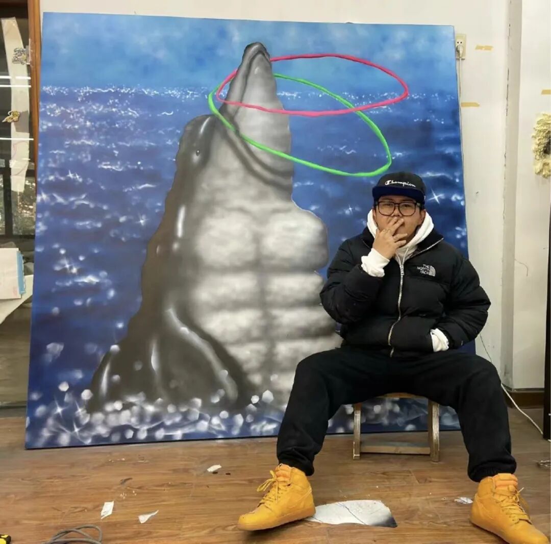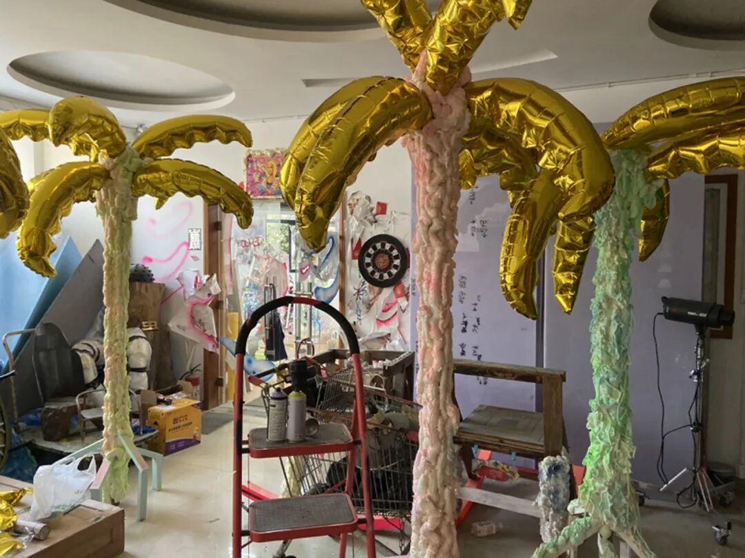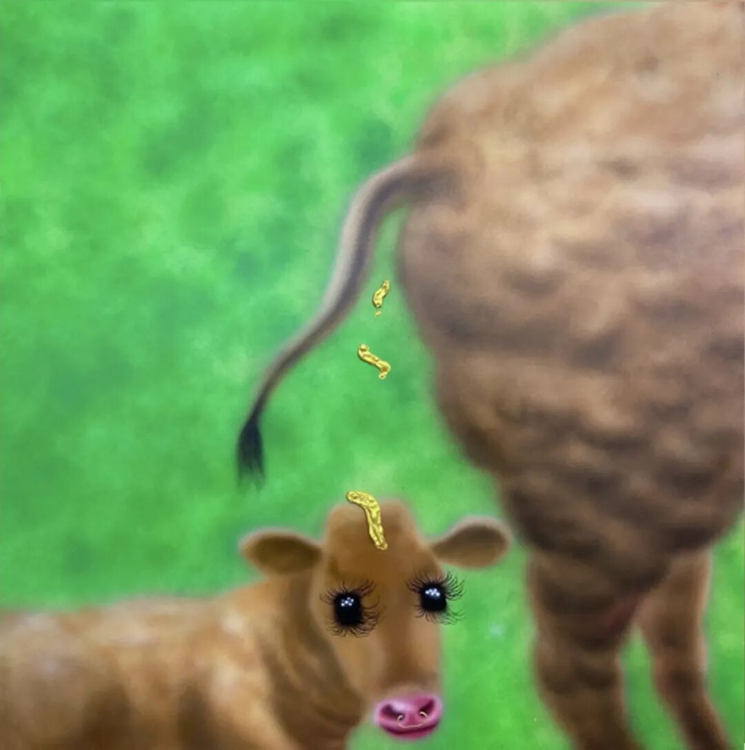 在近几年的创作中,丙烯和喷漆是尤阿达最常用的绘画方式,画面中反复喷涂而成的区域模糊又呈现出一种近乎平面的视觉效果,与部分清晰勾勒的轮廓线条、或是有厚度的金色颜料形成强烈的对比效果。大范围使用鲜艳荧光的颜色则让看似熟悉的日常图案变得愈发怪诞有趣。