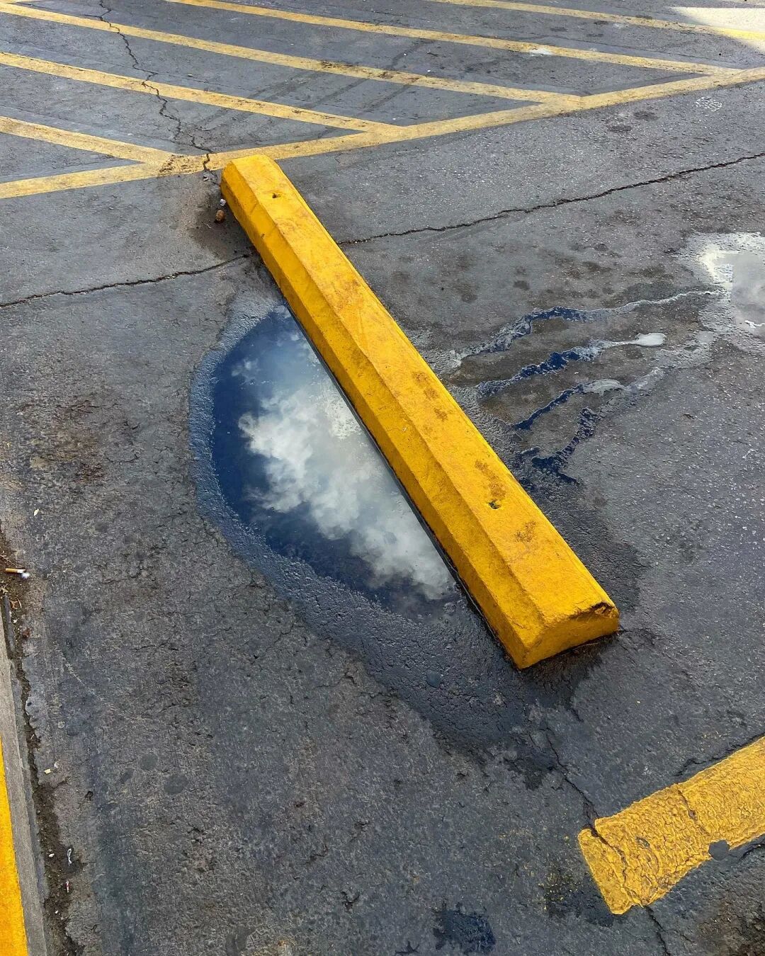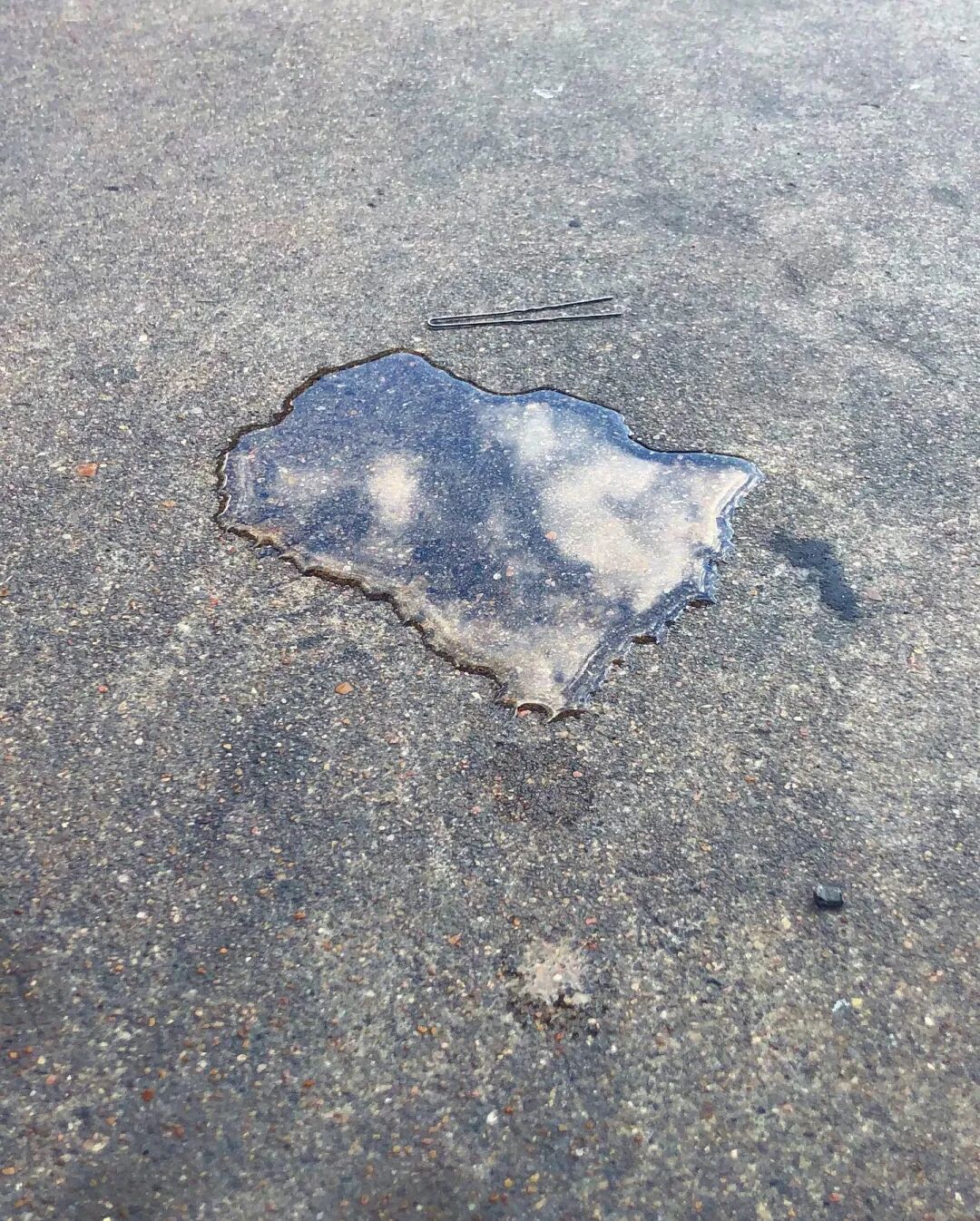 而艺术家杰弗里·迈克尔·奥斯汀就从这个生活场景获得灵感,创作了这一组作品。为了让画出来的水坑更加真实,这位艺术家没少追着水坑跑,雨停后,有时会出太阳,阳光照进街边的水坑里,会映出周围环境里的事物,比如街边的建筑,或者晴朗的天空。有时也会持续地阴天,这时候的水坑又是不一样的。