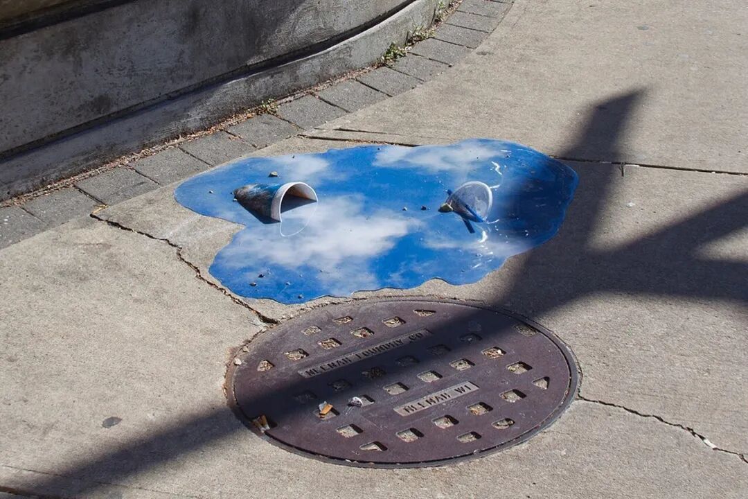 谈到创作这组作品的意图,杰弗里·迈克尔·奥斯汀希望人们能爱上街头艺术,让这门偏小众的艺术形式能被更多的人看到,感受到它的魅力。接下来,我们就一起欣赏这位才华横溢的街头艺术家,创作的精彩作品吧。如果你在路上看到这样一个水坑,敢不敢直接踩上去呢?